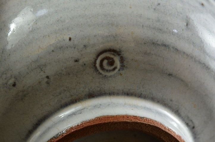 Old Agano ware chawan are are mostly mumei (unsigned or without any maker’s mark). Few are signed with potter’s name and there are even fewer which bear a date. Starting at the end of the Edo period the Agano ware was being marked with the spiral or ‘tomoe‘.
