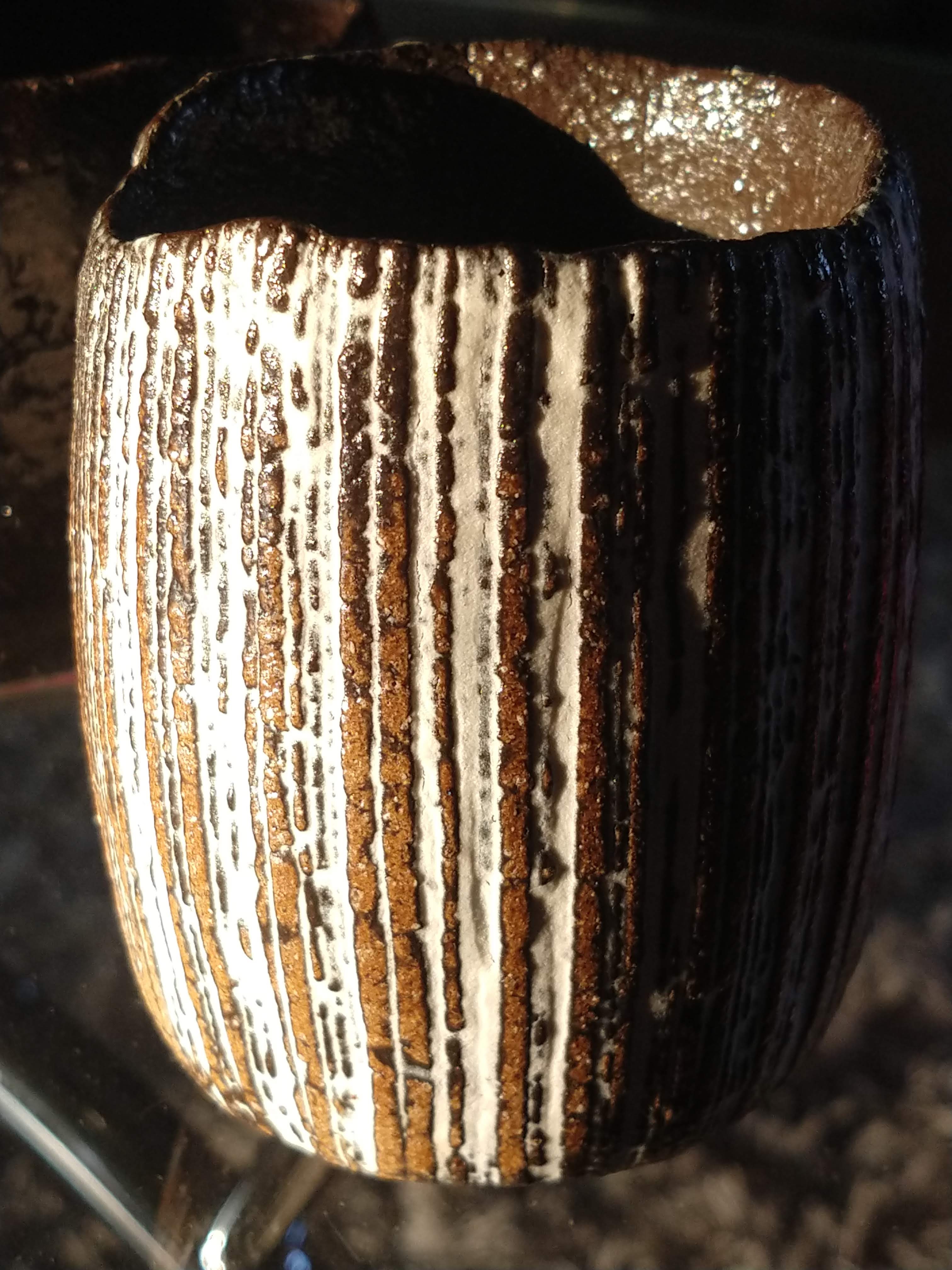 This is a quality kuro Bizen or black Bizen tea cup, inlaid with white slip in vertical strokes by one of my favourite potters; Kenji Takenaka. Circular in form with an undulating rim, having it in your hands it will quickly become a favourite piece as its smooth to the touch and masterfully shaped to connect. Kenji Takenaka was a jeweller and made the switch in the middle of his career and is now a full fledged potter. Even though starting potting late in life, he is now highly acclaimed and works hard to come by. His work is detailed and shaped with the same level of care as I imagine his jewellery shows. Hard to describe, this potter won me over the first time I held one of his cups. Bizen wares are fired slowly over a long period of time. Firings take place only once or twice a year. They require the kiln fire to be kept lit and burning for approximately 10 to 14 days involving long hours and literally tons of wood. Please see the following biography of this artist.