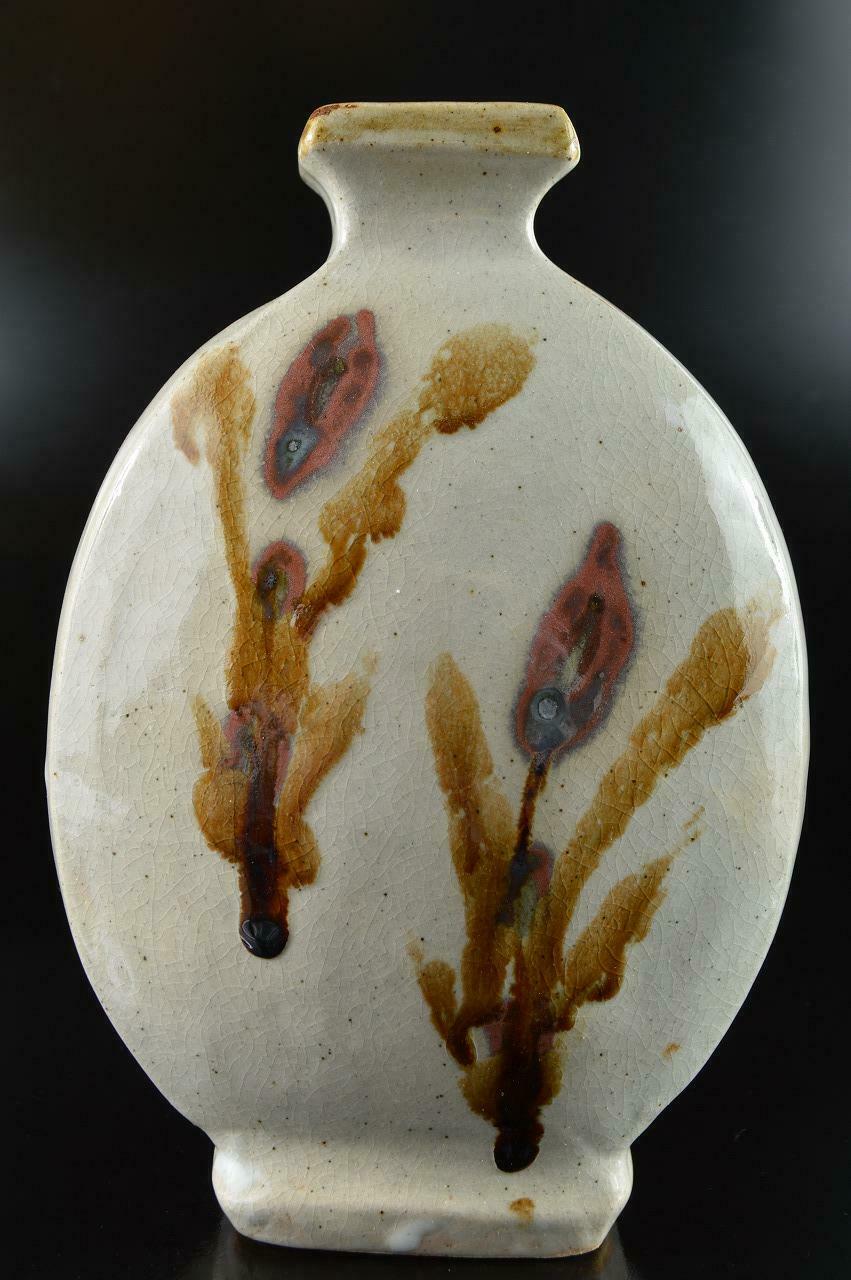 This is a large Mashiko ware vase with a kai-yu or ash-glaze – overlaid with a wax-resist decoration of flowers, made by famous potter Mitsuru Kimura (1939-1998). He was born in Fujihara, Tochigi prefecture in 1939. Through marriage with Kimura Ichiro’s first daughter in 1968, he started studying under his new father-in-law. Years pass and Kimura Ichiro retired from potting, Mitsuru inherited the name and became the second generation working from the kiln. Like this ash glaze and wax-resist decoration, his style is different from Shoji Hamada and Kanjiro Kawai – the defining masters that are responsible for initiating events which would lead to the creation of what is know as ‘mingei‘.