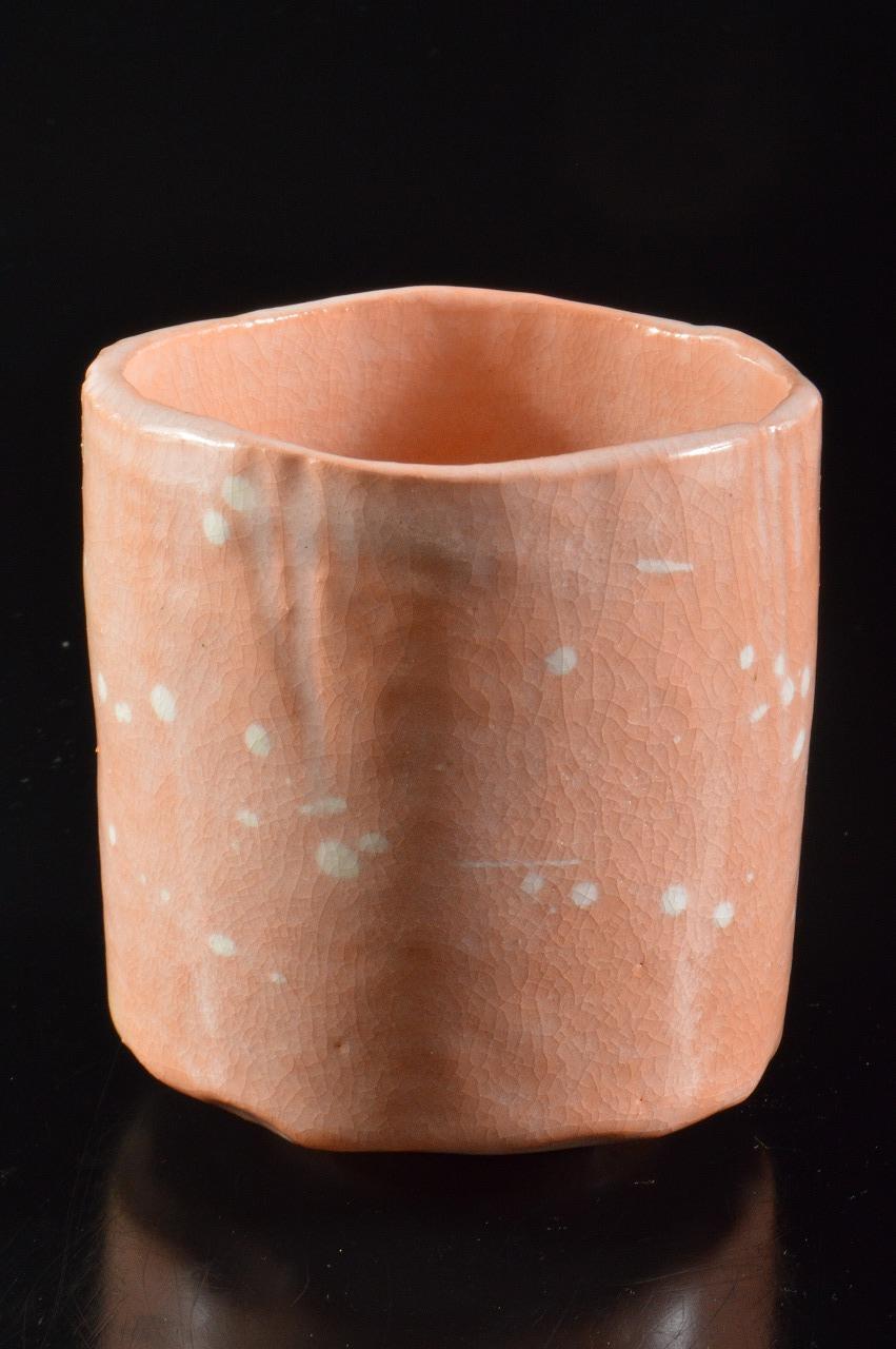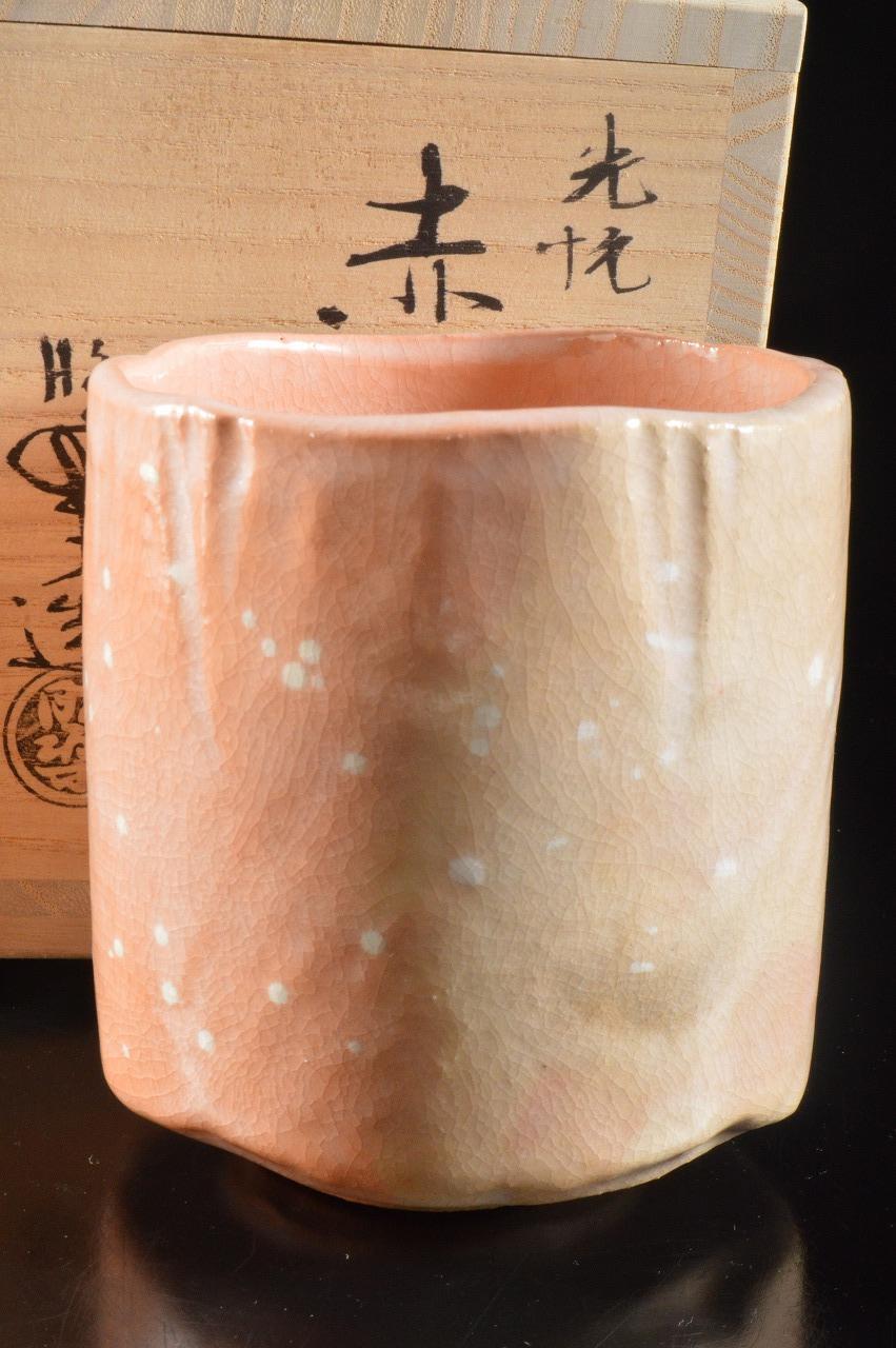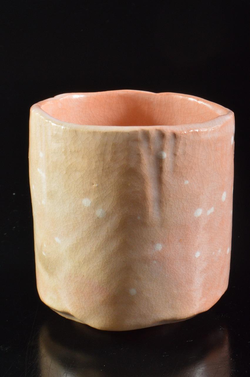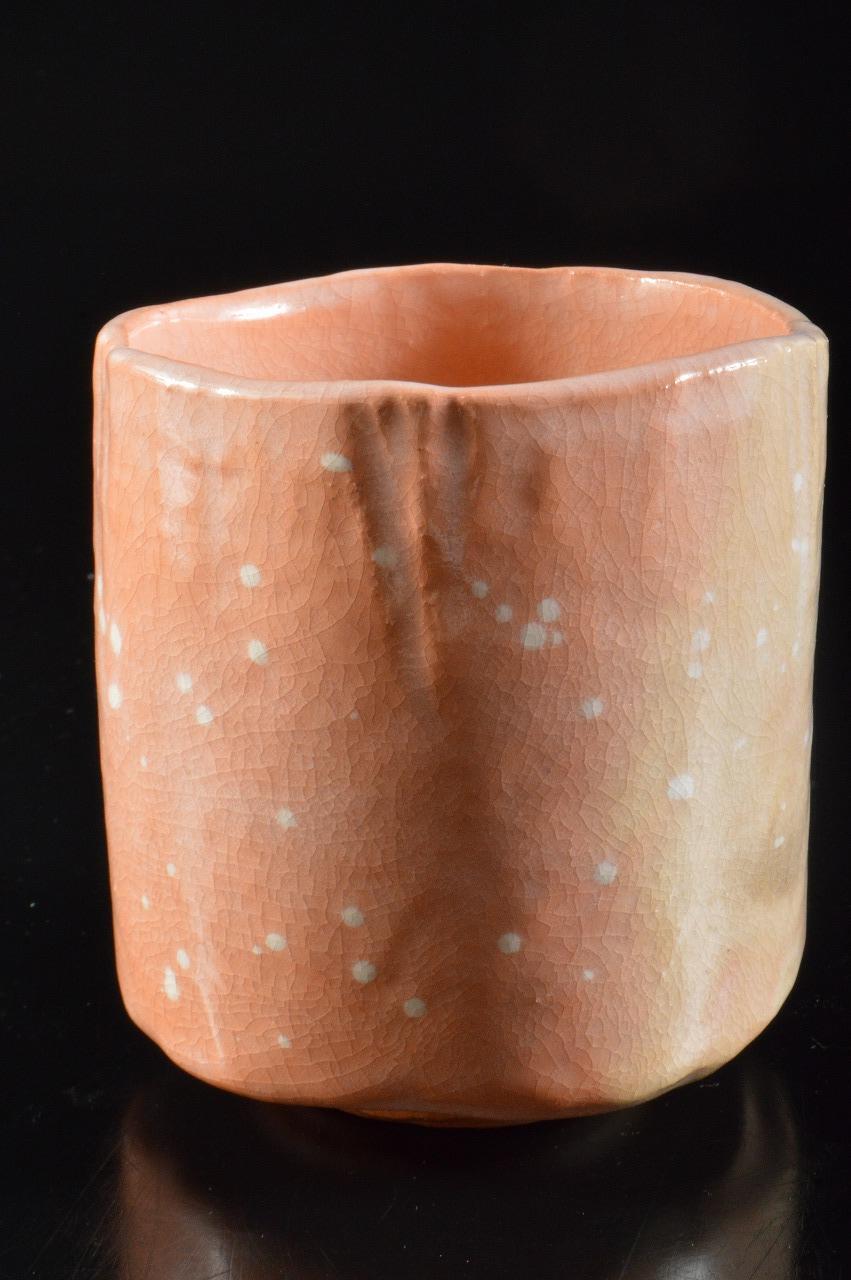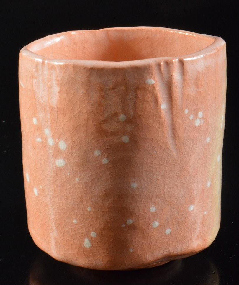 This exemplary aka or red Raku chawan was fired in the kilns of one of Kyoto’s best known Raku potters, the third generation Sasaki Shoraku (1944-). A light red – hues of pink Raku glaze covers this chawan and additionally it has what I interpret to be snowflakes, drizzling down the exterior. A charming piece that is in mint condition for someone to bond with. This family lineage began with the great-grandfather of the current successor who established a kiln near the famous Kiyomizu temple nestled at the foot of the eastern mountains in Kyoto. In 1945 the kiln was moved to Kameoka near the Yada shrine where it remains until today.