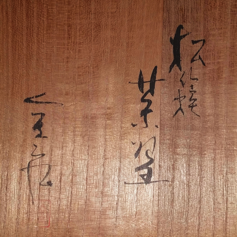 The chawan is stamped by the potter next to the koudai or foot of the bowl. There are no chips or cracks and condition is mint. Comes with the original high quality, shiho-san paulownia tomobako or storage box with the artist’s calligraphy and seal on the lid, a pamphlet with a simplified biography of Zenko Yasuda and tomonunu or tea-cloth. Out of the small collection of works I managed to get my hands on, this is one of two that has a shiho-san tomobako, testifying to the quality of the work.