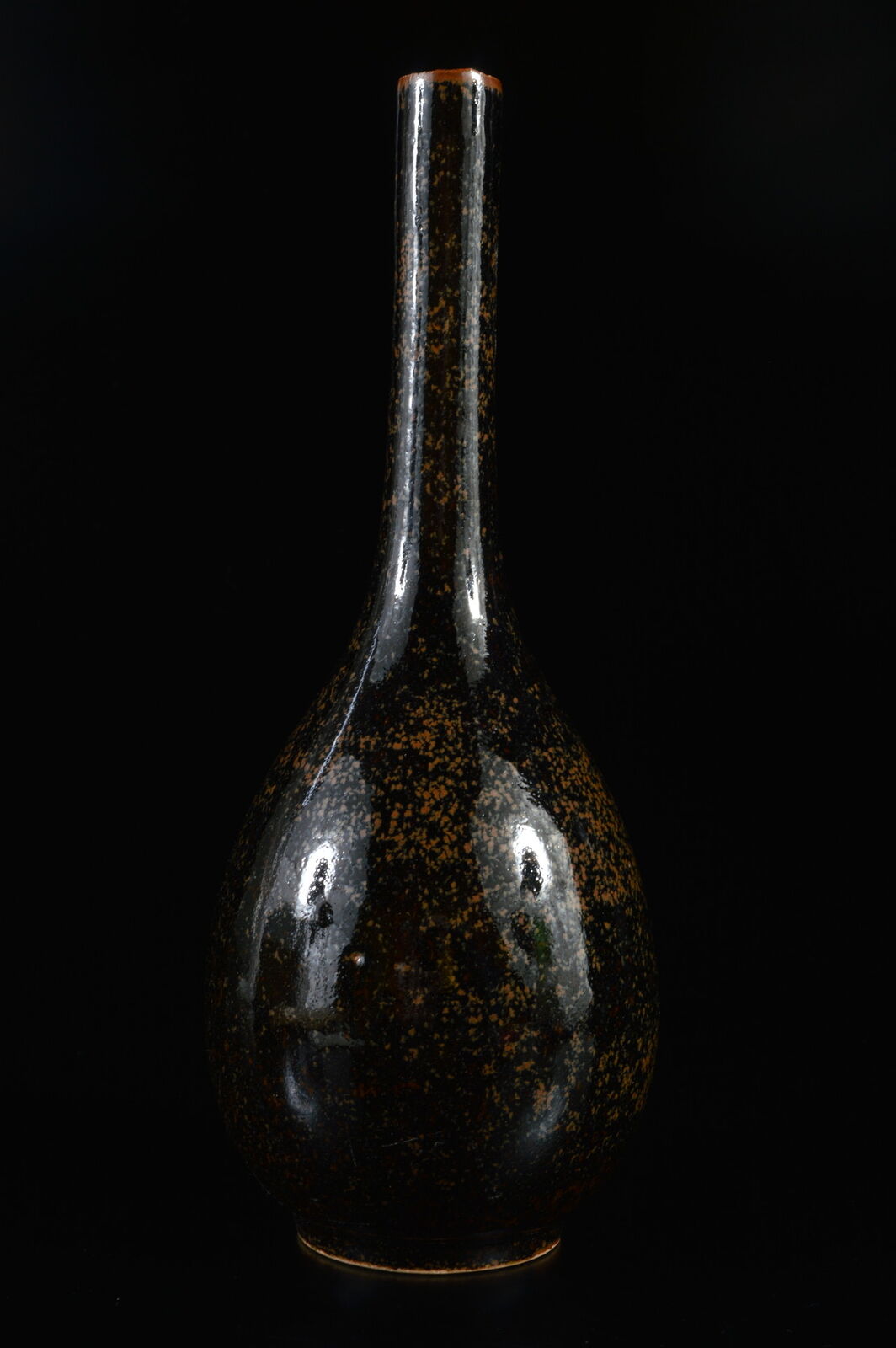 This is an exquisite yuteki or oil-spot ame-yu hanaire or spotted amber glazed flower vase made by Ohi Toshiro (1927-), the tenth generation and current successor of the prestigious Chozaemon family, which has been associated with the world of the Japanese tea ceremony since the 17th century. By using special picks and tools, the Ohi master chips away moist clay until bowls or cups has taken form. The glazes are magnificent earth tones and black glazing is often applied as with Raku but the trademark – an amber glaze called ame-yu is the epitome of the style. This vase features a variation between what could be termed an tenmoku or oil-spot ame-yu and the classic pure amber glaze.