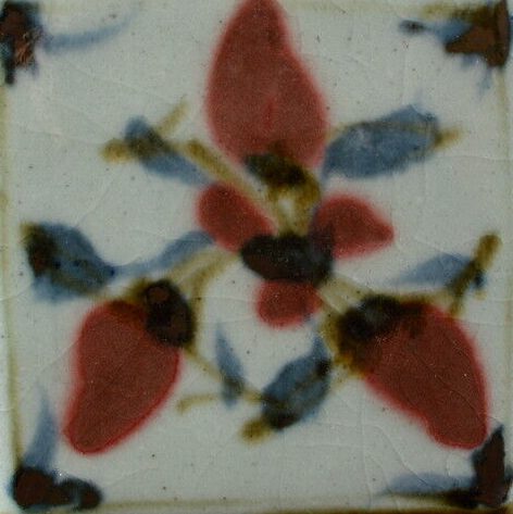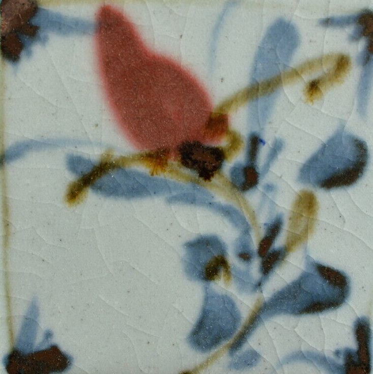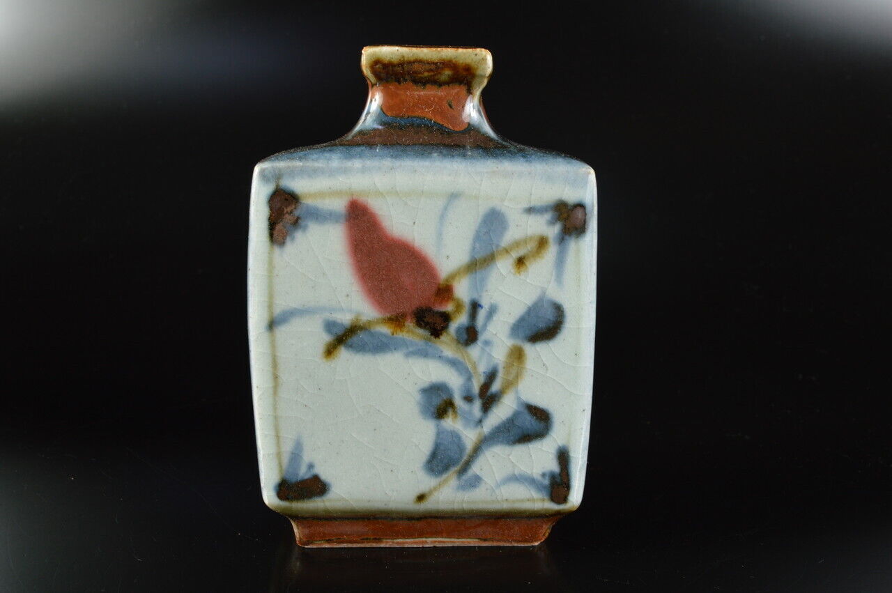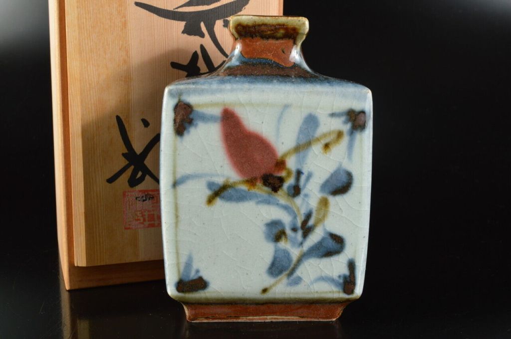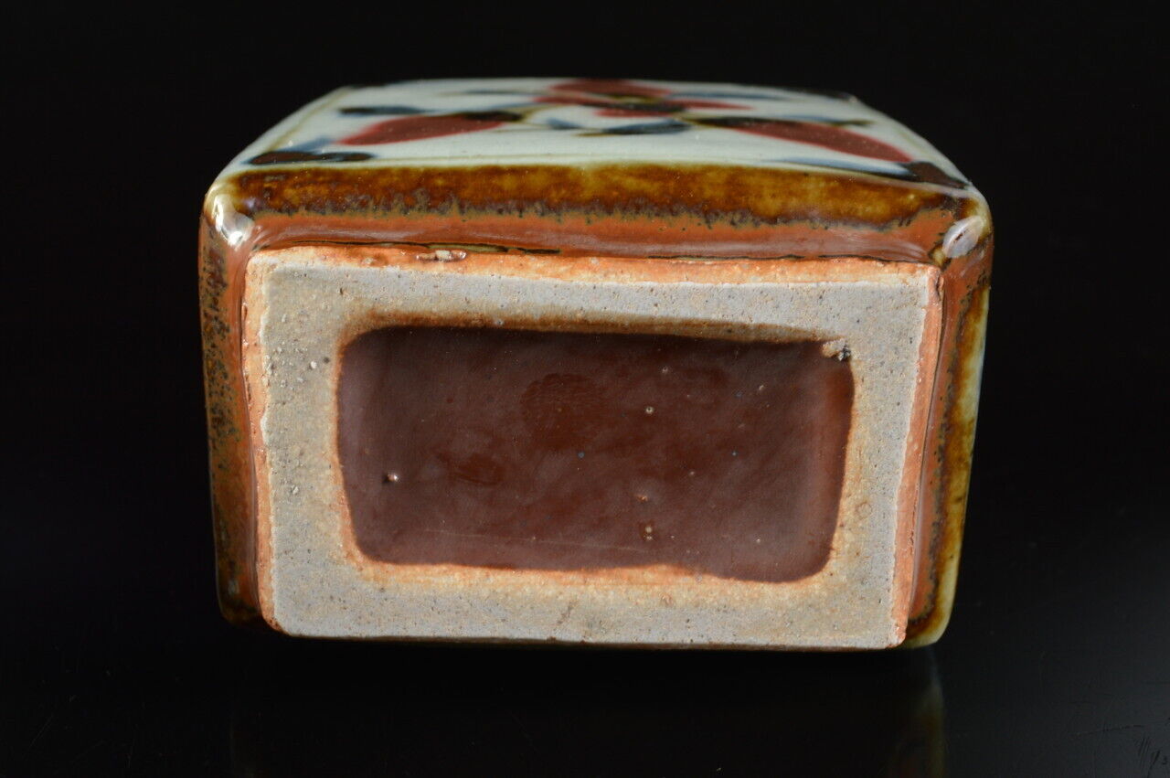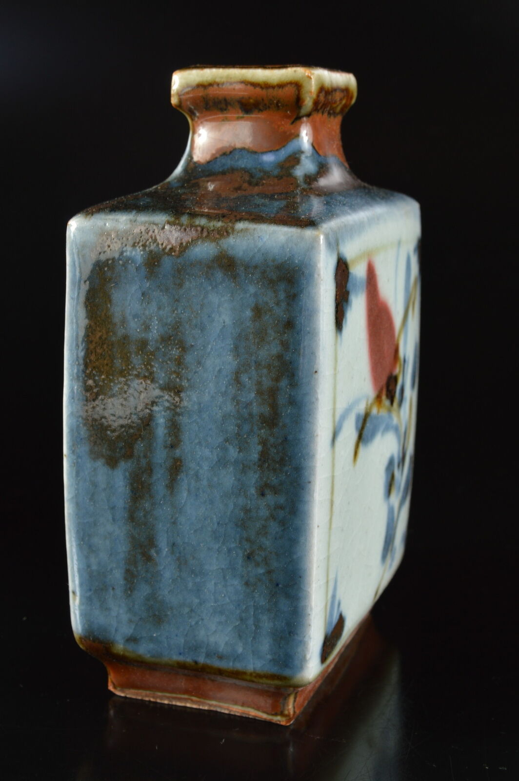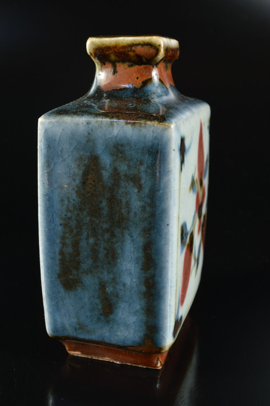 This charming square vase was made by Kawai Takéichi (1908-1989), who’s nickname was ‘Buichi‘. Buichi was a nephew of the legendary Mingei giant Kanjirõ Kawai, who was one of thé initiators of the Mingei movement. Takéichi apprenticed himself to his uncle and their collaborations lasted for more than 40 years. This is a square vase for ikebana but is also a excellent display piece on its own. These types of flower containers tend to be described as ‘henko’ vases. On the front and backside are loosely rendered, hand painted floral motifs in the classic Kawai gosu – cobalt blue and red under-glazes on a white backdrop. Works from the later period of Kawai Takéichi’s career were wood-fired in a four-chambered noborigama – climbing kiln which he established with his son in 1978 in a rural area of Kaméoka City, Kyoto prefecture.