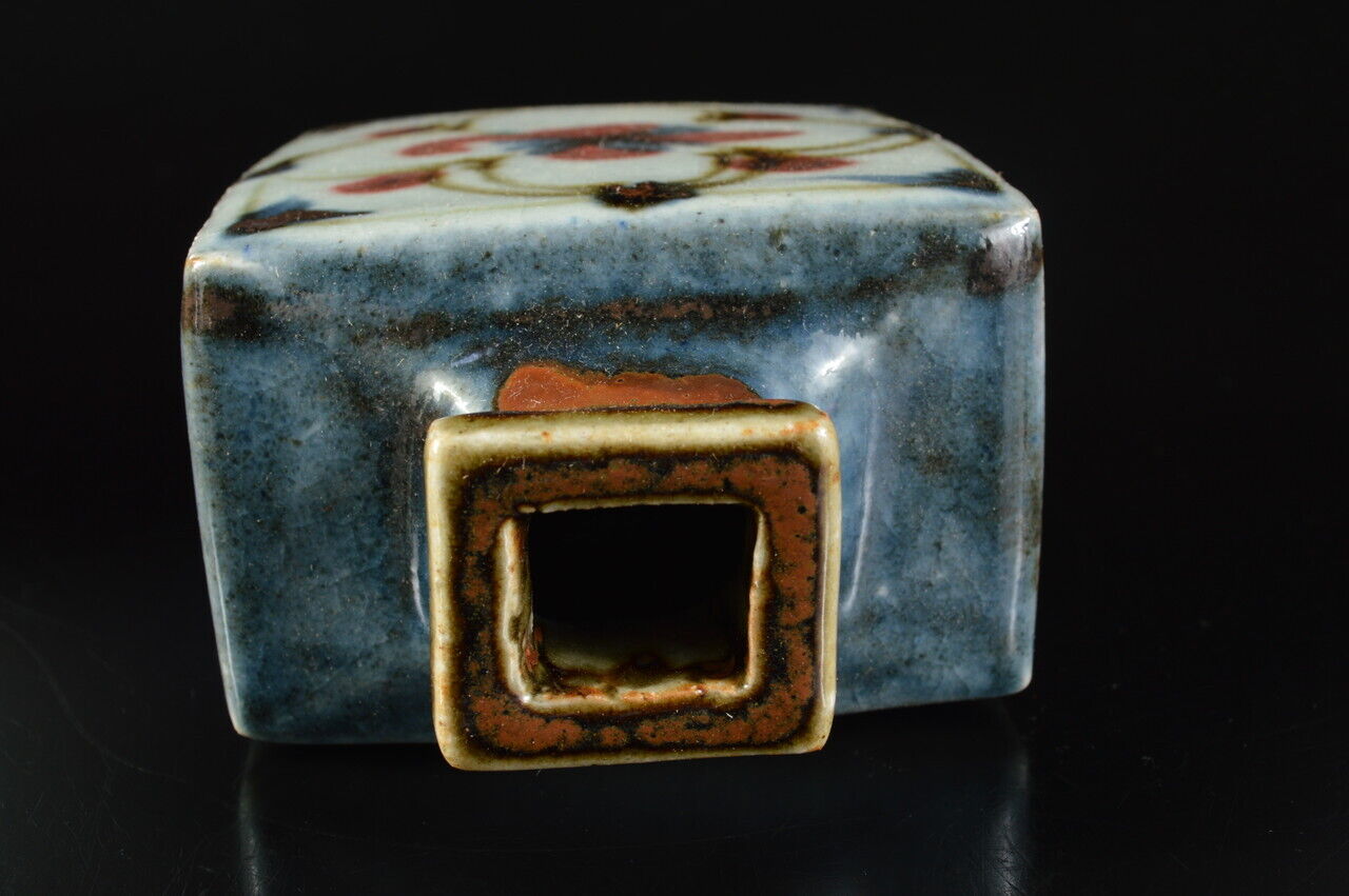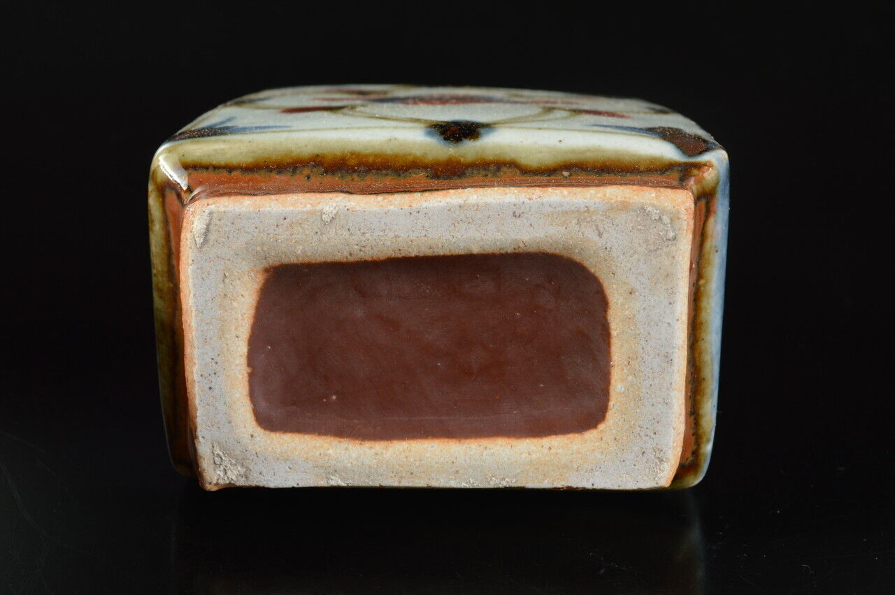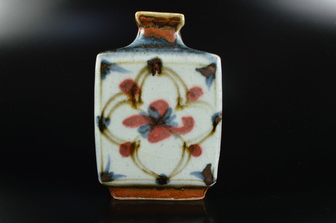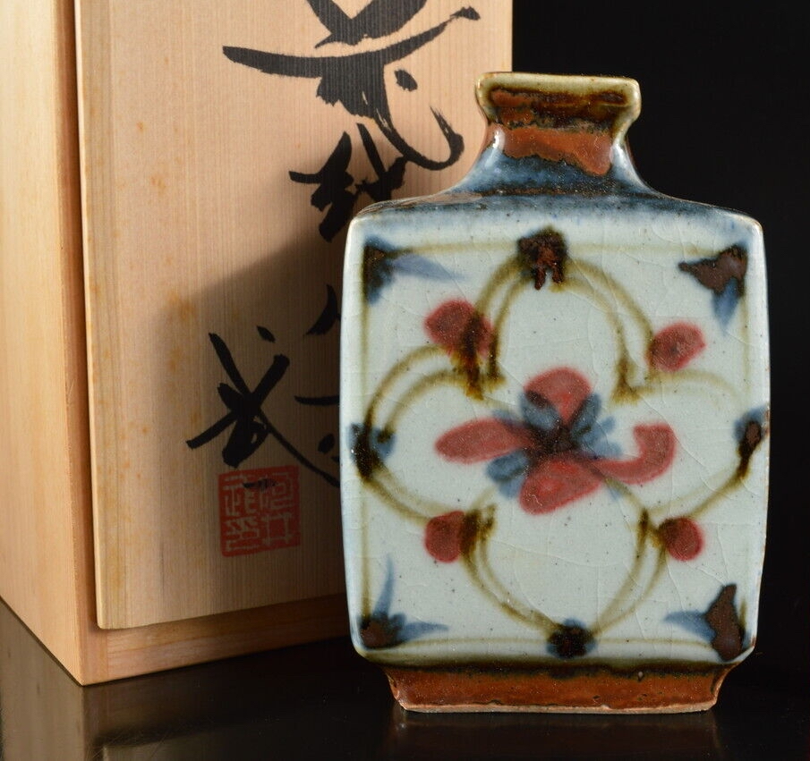 This charming square vase was made by Kawai Takéichi (1908-1989), who’s nickname was ‘Buichi‘. Buichi was a nephew of the legendary Mingei giant Kanjirõ Kawai, who was one of thé initiators of the Mingei movement. Takéichi apprenticed himself to his uncle and their collaborations lasted for more than 40 years. This is a square vase for ikebana but is also a excellent display piece on its own. These types of flower containers tend to be described as ‘henko’ vases. On the front and backside are loosely rendered, hand painted floral motifs in the classic Kawai gosu – cobalt blue and red under-glazes on a white backdrop. Works from the later period of Kawai Takéichi’s career were wood-fired in a four-chambered noborigama – climbing kiln which he established with his son in 1978 in a rural area of Kaméoka City, Kyoto prefecture.