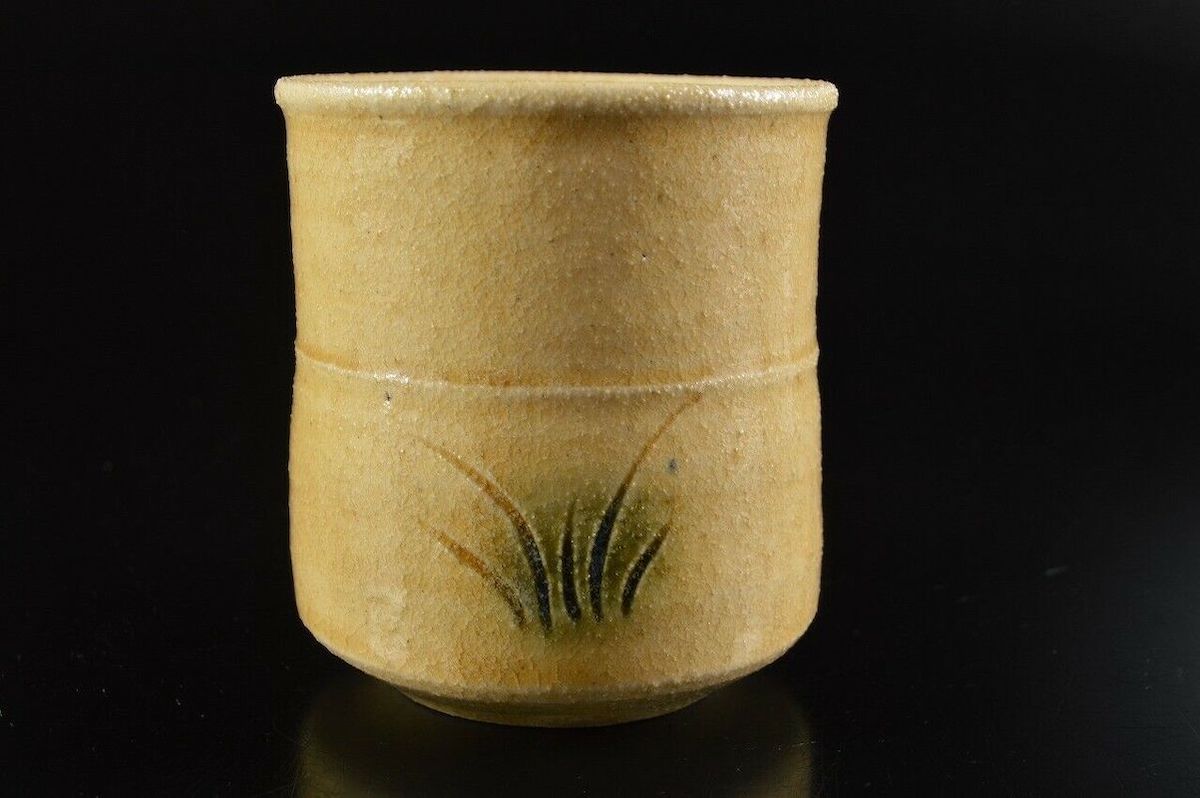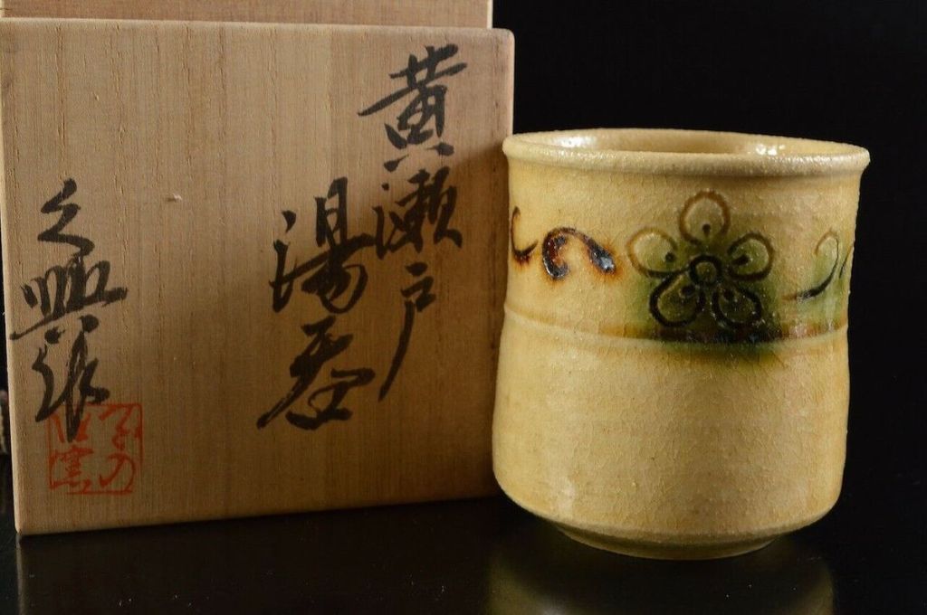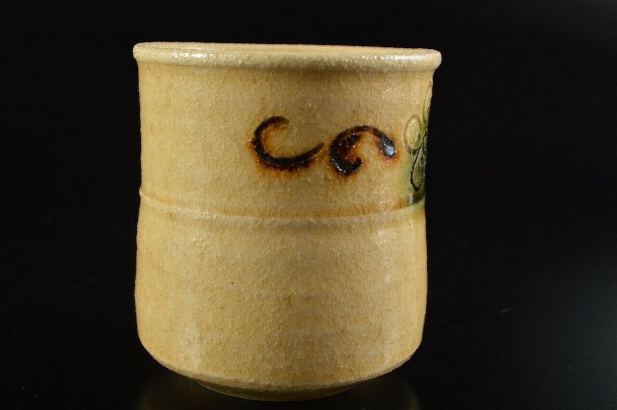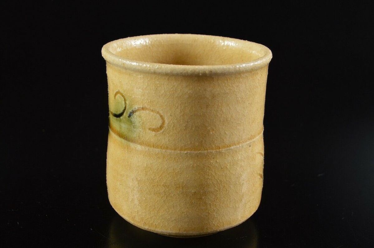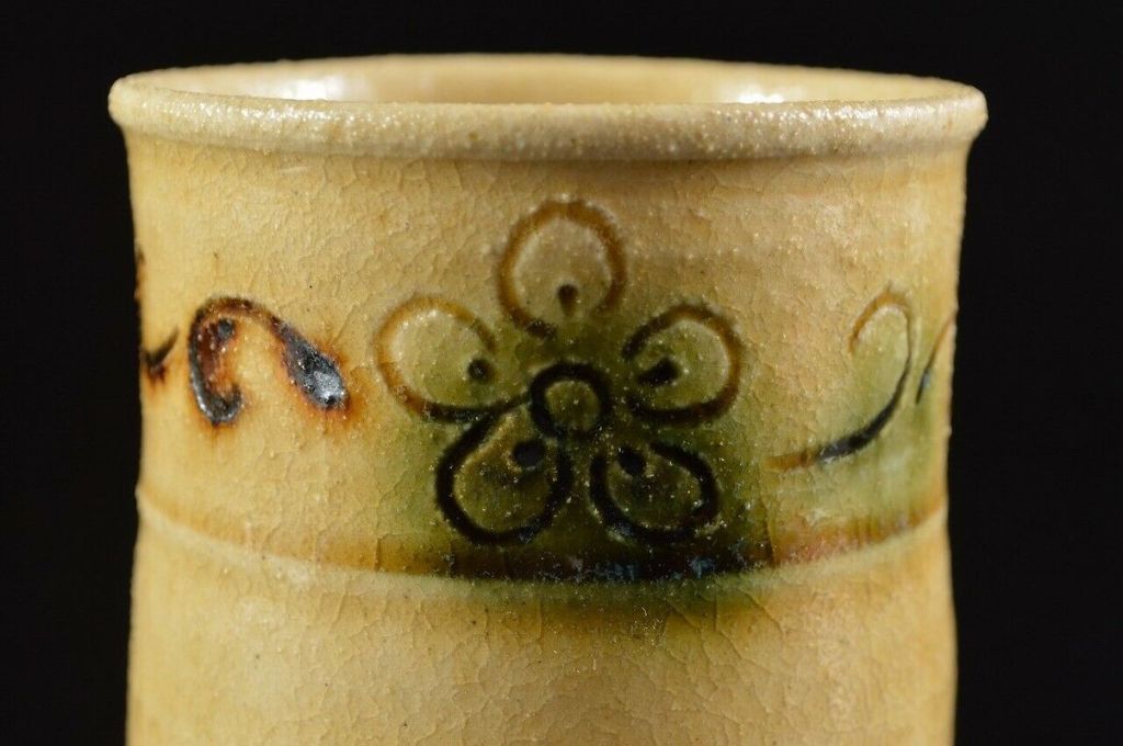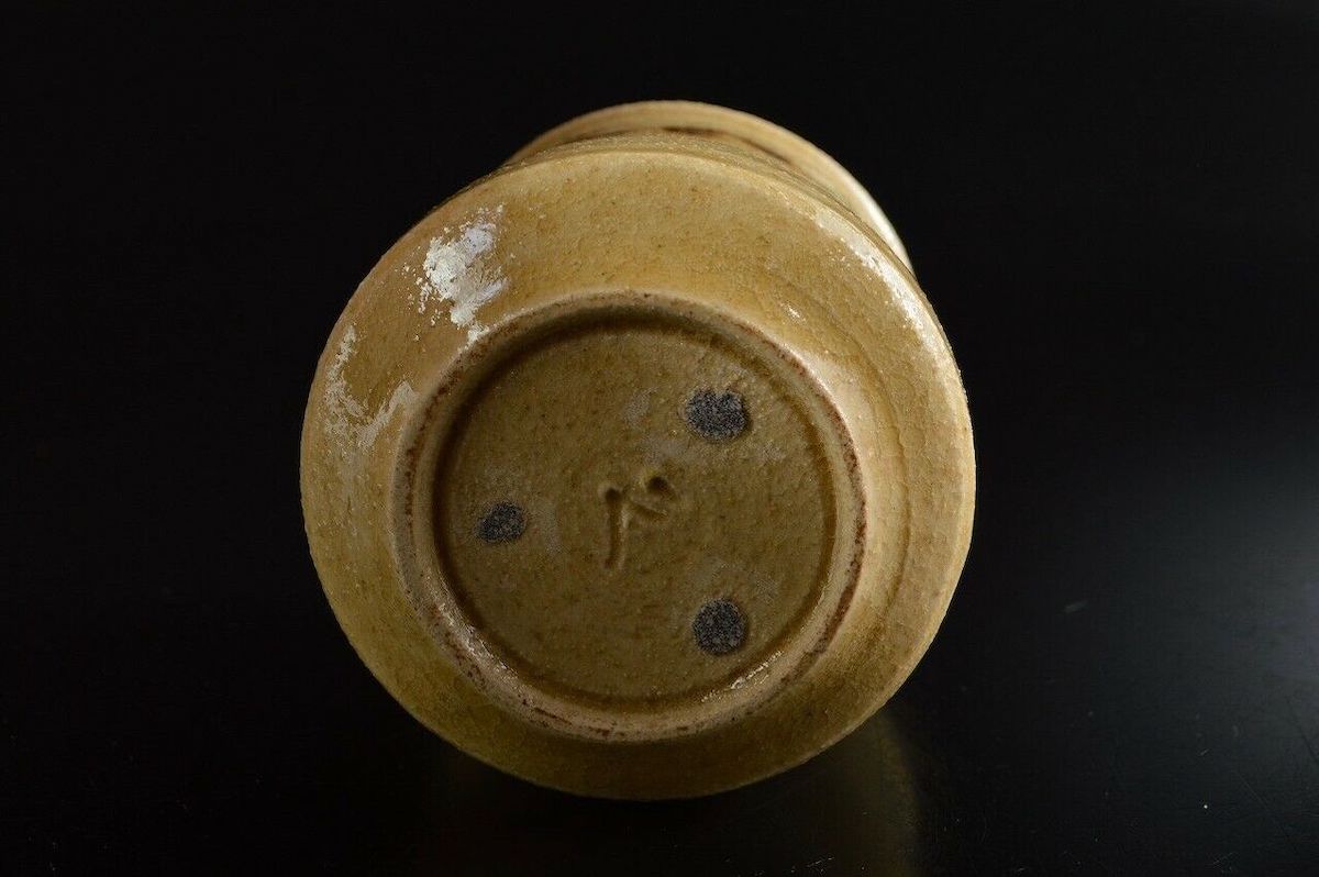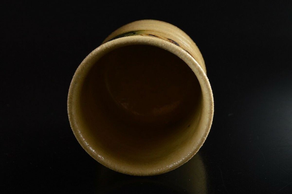 For your consideration is a charming ki-Seto yunomi or tea cup by famous Seto potter Ōshima Hisaoki (1944-). He works from Nenohi-gama in Toki City, Gifu prefecture. Ki-Seto glaze contains a little amount of iron and produces yellow-brown colour. Towards the end of the 16th century, what is known as the Momoyama period, a potter from Seto moved to Mino province (now Gifu prefecture), and developed this glaze. Ki-Seto often have designs or motifs in green achieved through the addition of small amounts of copper sulfate and firing temperatures. This particular example is a slightly smaller version of the other near identical cup listed by this maker.