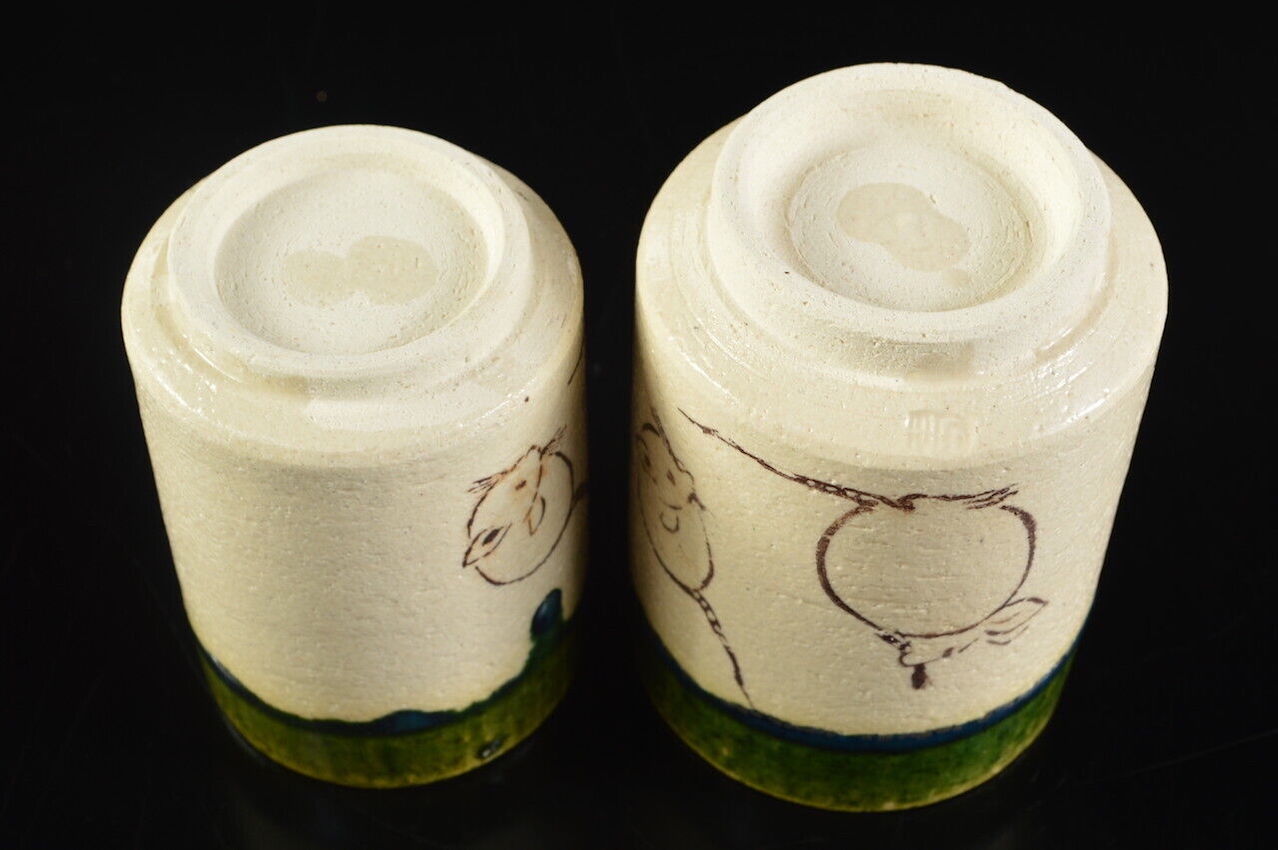 This is a set of two yunomi or tea cups. In Oribe style this pair feature a cheerful motive of mice scurrying about. The decorations are hand painted in a way that has a flair or charm of its own which leads me to believe the maker must be either experienced in the way of the brush or has had a lot of practice. Details such as the potter’s (art), name and kiln are as of yet unknown and require further attention.