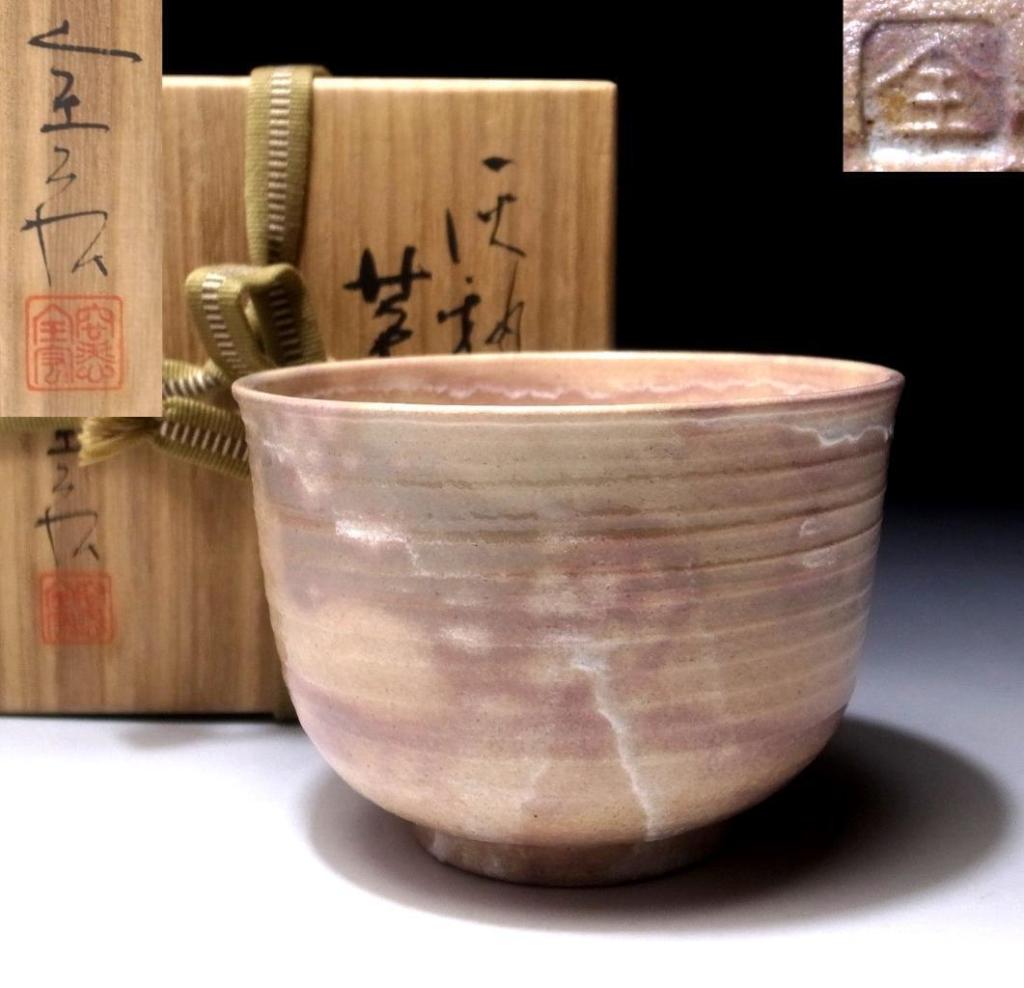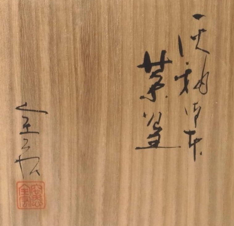 The chawan is stamped by the potter next to the koudai or foot of the bowl. There are no chips or cracks and condition is mint. Comes with the original paulownia tomobako or storage box with the artist’s calligraphy and seal on the lid and a blue tomonunu or tea-cloth.
