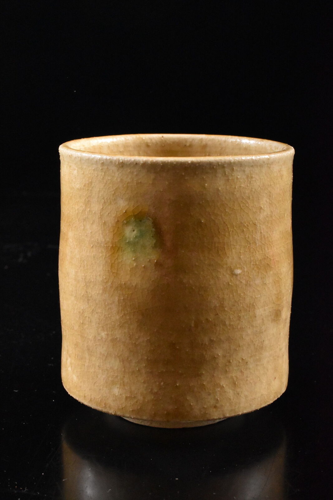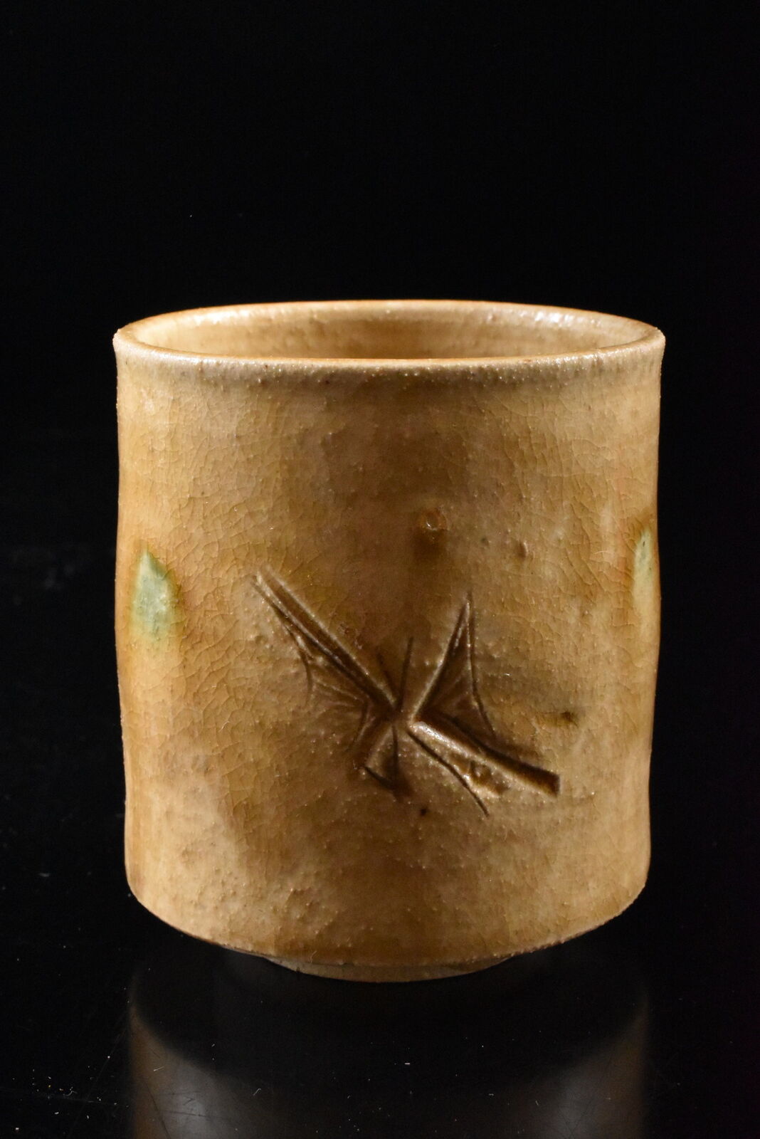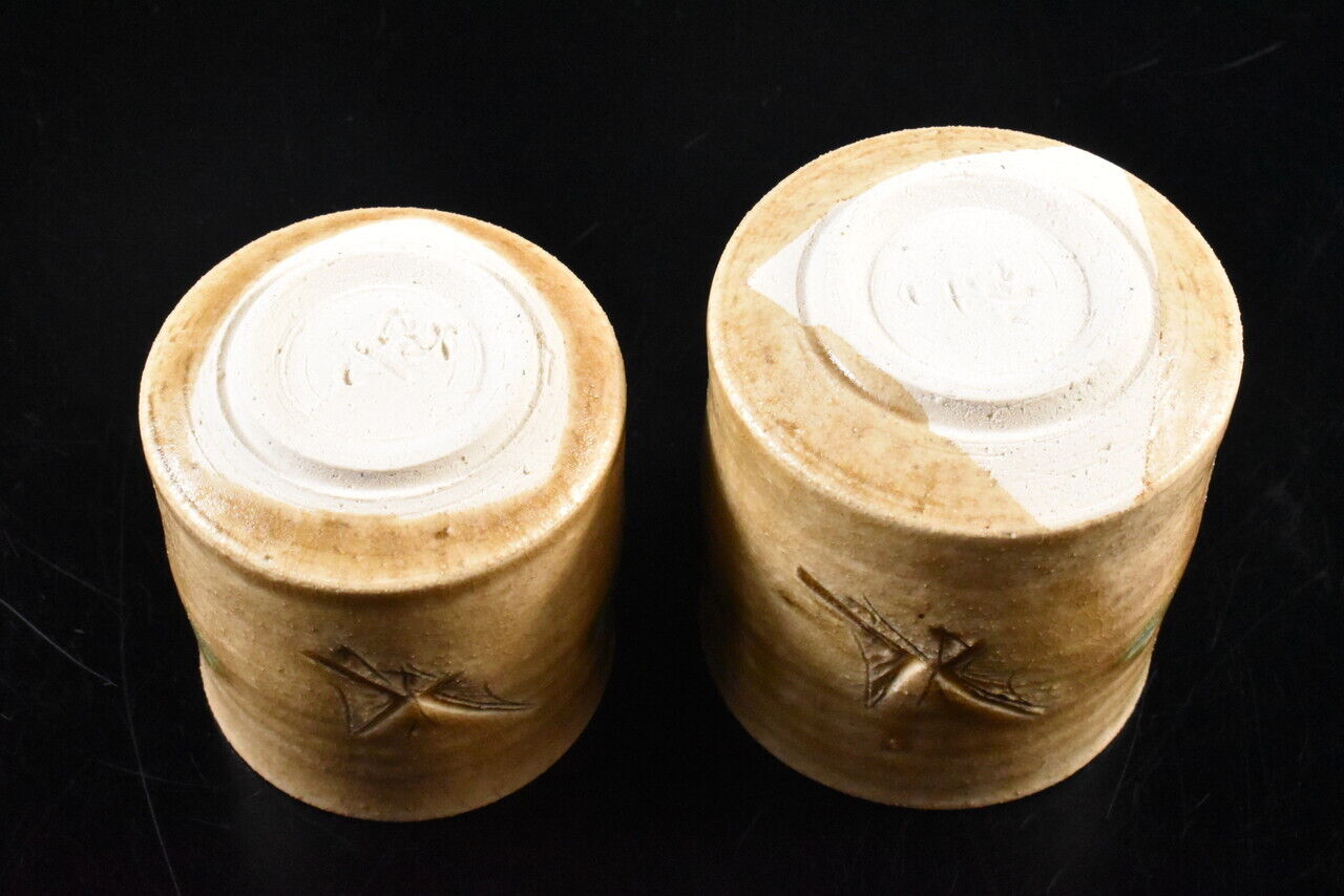 A pair of ki-Seto yunomi or tea cups by the 1st class potter Sho Kato (1927-2001), who in the year 2000 was designated as a Human Cultural Treasure of Aichi Prefecture. Sadly he passed one year later. This pair feature his signature butterfly or ‘chou’ incised on the front of both cups. At times painted by hand though more often seen sharply incised, butterflies as seen here are a telltale sign of this potter’s work.