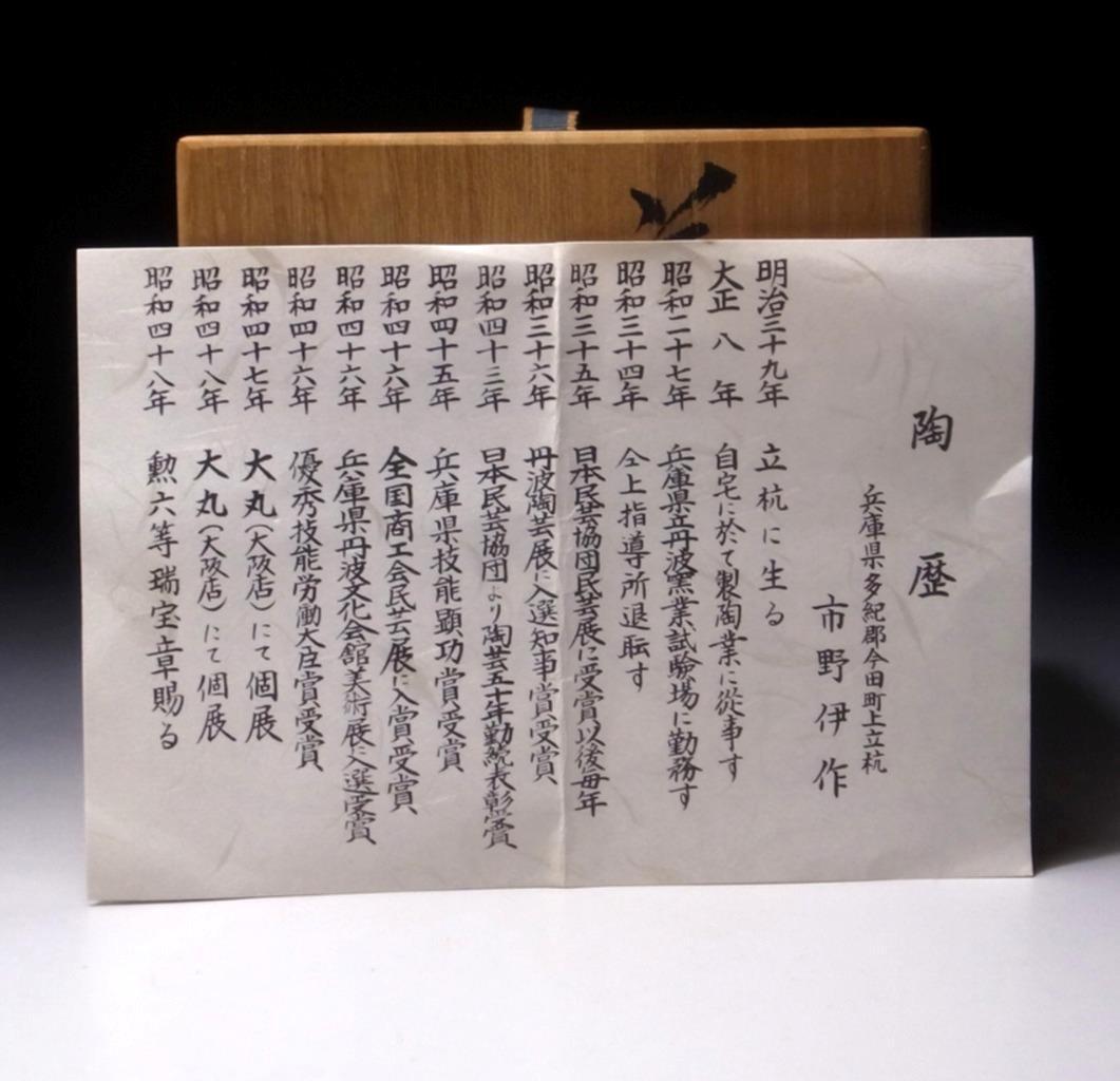 This is a fine Tamba chawan or ceremonial tea bowl made by the famous potter Isaku Ichino (1906-). Tamba ware is pottery made in what is known currently as Hyogo prefecture. The glaze on this bowl is quite varied, both in structure and colour and at the same time shows many detail. Gradually widening from the foot is sits on a sturdy and high koudai or foot ring. Tamba ware honours the ancient techniques of firing pottery in an anagama kiln. The firings may take anywhere from 48 hours to 12 or even more days. The kiln generally takes the same amount of time to cool down as rapid cooling would cause much breakage. Records of historic firings in large kilns shared by several village potters describe several weeks of steady stoking the fire.