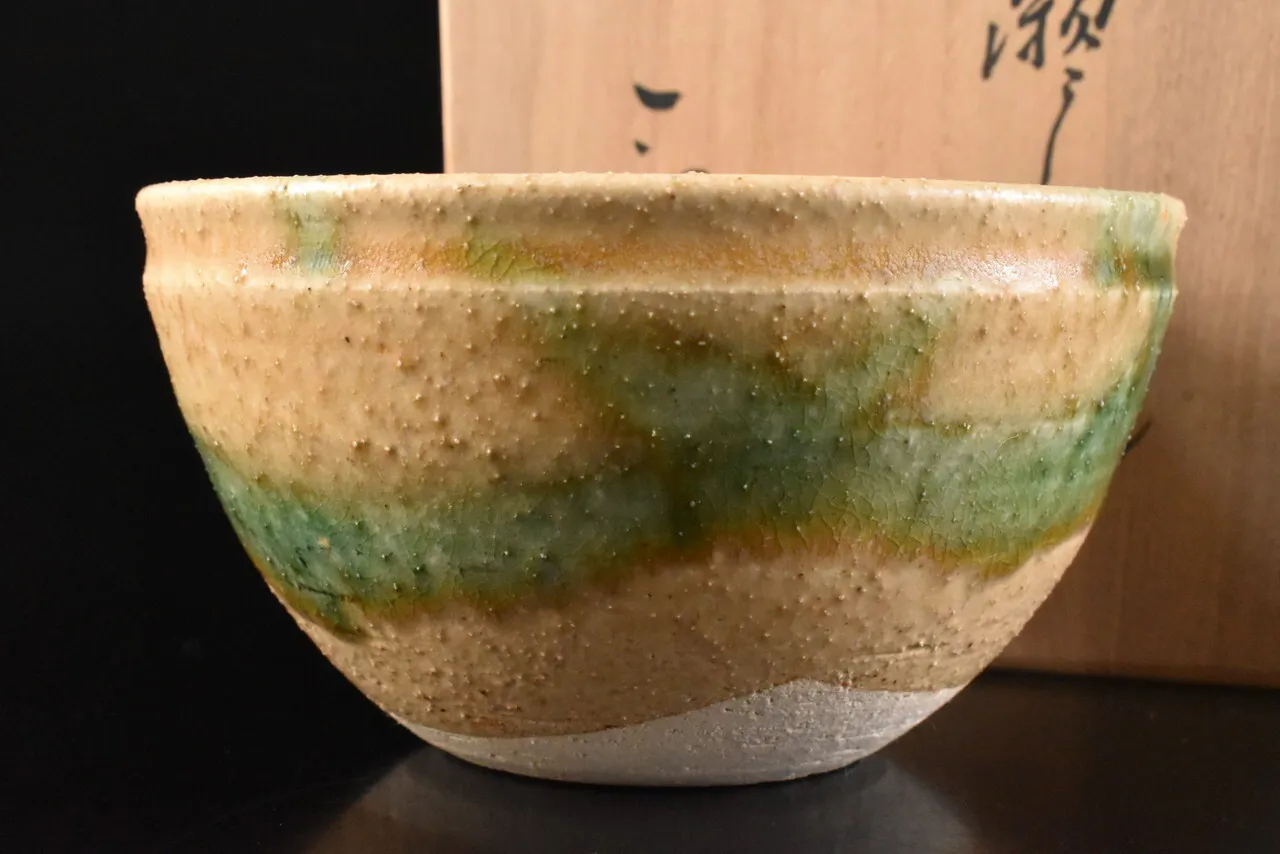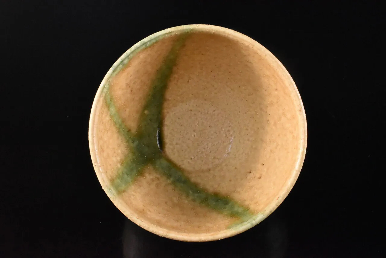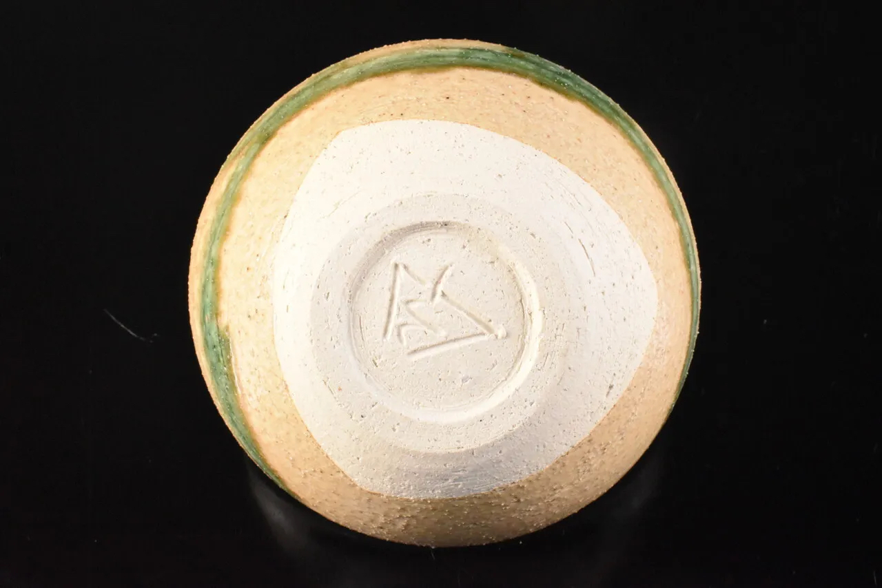 This is a ki-Seto or yellow Seto chawan by the famous Seto potter Kato Reikichi (1953-). Chawan are ceremonial tea bowls that are intended for use in the Japanese Tea ceremony and this appears to be a modernistic interpretation of ki-Seto, mainly because of the exhibited control of the green glaze. More on how such effects are created below. Reikichi was born into a famous Akazu pottery lineage as the son of the highly acclaimed potter and glass worker Sho Kato (1927-2001). He graduated from Tamagawa University before focussing on pottery. Reikichi Kato’s work tends to be centred around the use a purple glaze (of his own devising), kuro-gesho and mishima-de (a from origin Korean, slip inlay technique). His grandfather Josuke, a potter also and was notably involved in the advancement of the craft. This is a lineage that passes on techniques and knowledge and continually hones the craft from generation to generation. Reikichi Kato is also a long time member of the Japan New Craft Art Association.