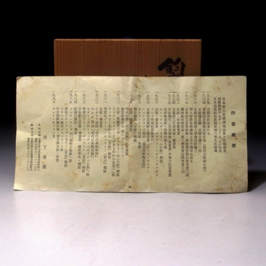 Early in his career he started celadon, which is considered to be one of the most difficult glazes as it relies heavily on shape and extreme control of firing to result in flawless pieces. He worked with and was inspired by artists like Yagi Kazuo, Suzuki Osamu and Kiyomizu Kyūbey. Miyashita was affiliated with Seitōkai and the Nitten group (starting in 1964), exhibiting in their annual competitions, which he won 18 times. His works have been included in exhibitions throughout the world and were acquired by major museums in Japan, the US and Europe. It is no exaggeration to say he was one of the most famous potters of Japan.