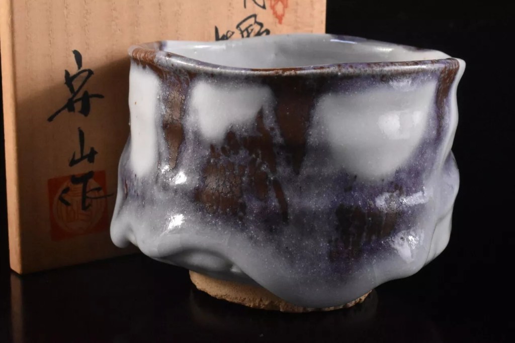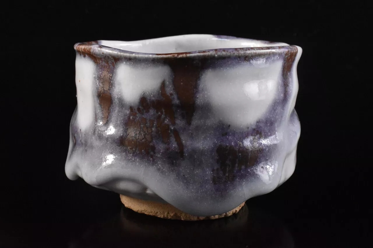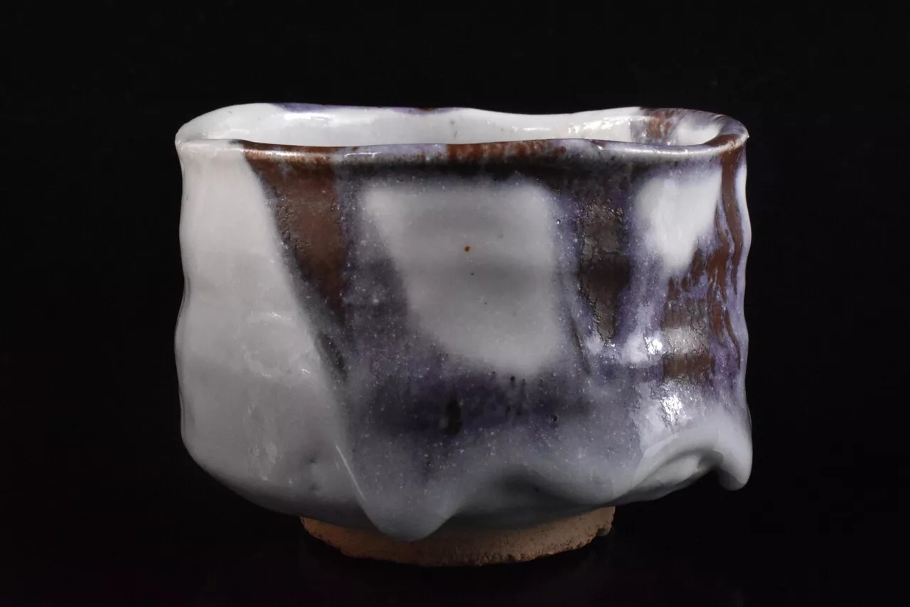 This is a high-class Shino tea bowl made by veteran potter Shuzan Mizuno. This artist managed to make his work distinct in the vast world of Mino. Shino falls under the Mino influence of old which nowadays is Gifu prefecture. This is a monumental chawan with a very thick and creamy feldspar glaze which fluxed to a nice purple. This type of glaze tends to easily flow out of control making it difficult to control. The dark burned area’s of the glaze have a higher iron content than the surrounding feldspar which is burned during the excessive wood firing. This is well balanced work meant for formal use in the Tea ceremony. It is worth mentioning that the interior (while difficult to see on the photos above (and even harder to capture on camera)), has a thick layer of glaze as seen on the outside of the bowl. Having studied this chawan in hand I can vouch for its exceptional quality, atmosphere and beauty.