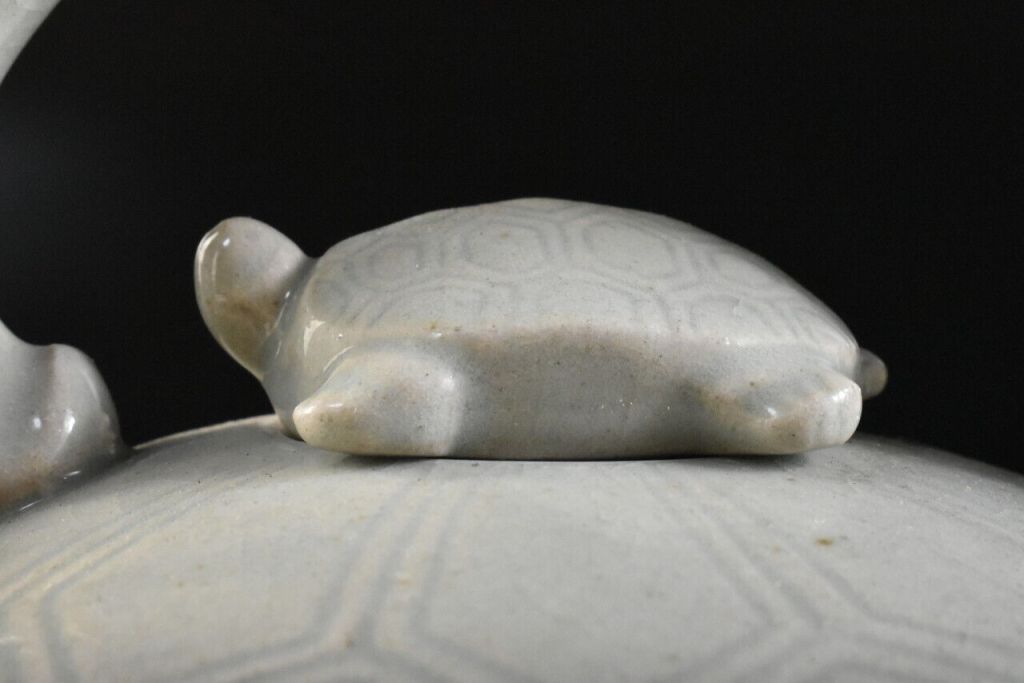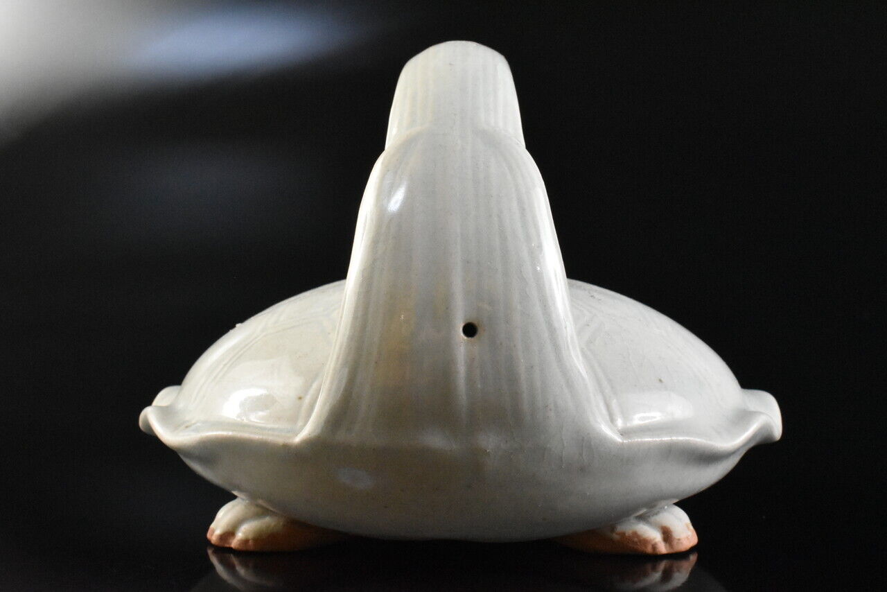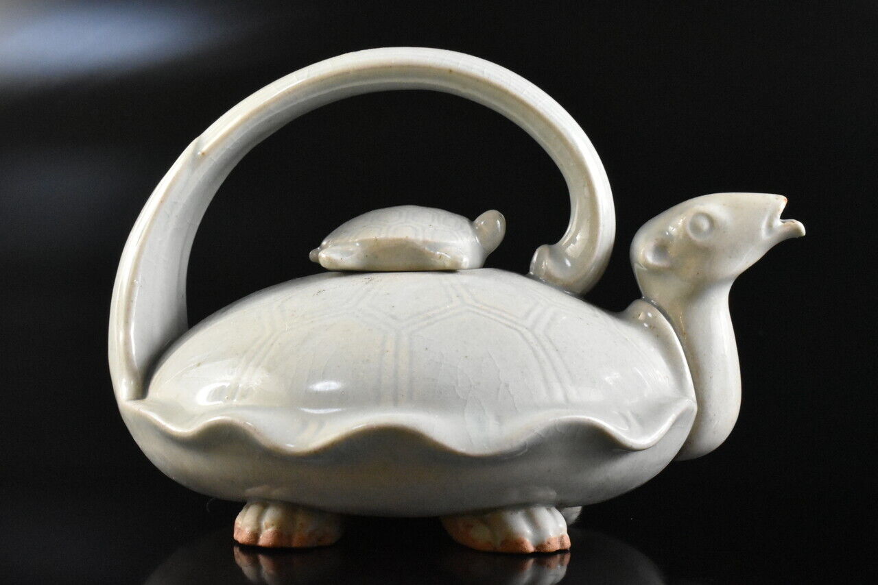 This is an exquisite Fushina tortoise or turtle shaped tea pot. The lid is also shaped as a little turtle or tortoise. I have seen this shape in Fushina, Takatori and Mikasa ware though none of the aforementioned kyusu were this fine in their execution. Fushina ware is pottery that originates in Shimane prefecture. The turtle symbolises a long and happy life because the animal can live for a relatively long time. This is why centuries ago, a proverb originated in Japan saying ‘A crane lives for a 1000 years and a turtle lives for 10.000 years’. This is an particularly fine example and quite rare. Over the last decade I’ve seen only 3 on the market.