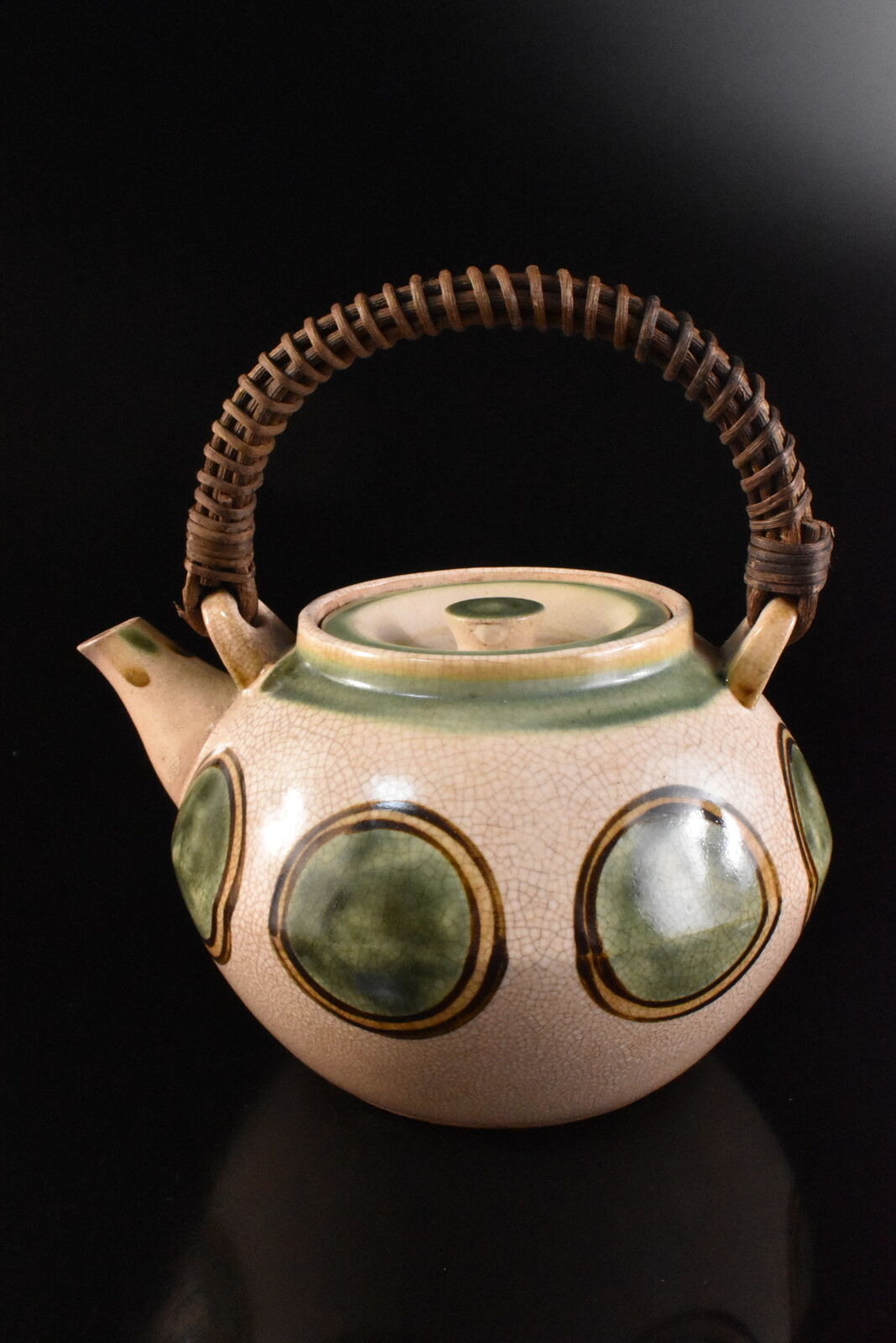 This is a set of 6 yunomi or tea cups and a tea pot by the renowned potter and Living National Treasure Tomimoto Kenkichi (1886–1963). Tomimoto Kenkichi was an outstanding and innovative ceramic artist. He specialized in over-glaze enamels. His varied and striking designs and colours have ensured his fame as one of Japan’s leading artists of the twentieth century. Tomimoto Kenkichi was born in 1886 in the village of Ando (安堵), on the outskirts of Nara not far from the famous temple complex of Ho ̄ryu ̄ji (法隆寺), which contains the oldest wooden buildings in the world (dating from the end of the seventh century), and some of Japan’s finest ancient architectural and artistic treasures. The temple had a profound influence on Tomimoto’s development as an artist. He returned often to Ando and his house and studio with its store-houses have now been preserved as the Tomimoto Kenkichi Kinenkan memorial museum (記念館). The buildings in traditional Nara style form a small group and contain a permanent if limited display of representative articles made and decorated by the artist. Many of the finest examples of Tomimoto’s work belong to the Nara Prefectural Museum, but the museum’s exhibition halls are normally devoted to special exhibitions.