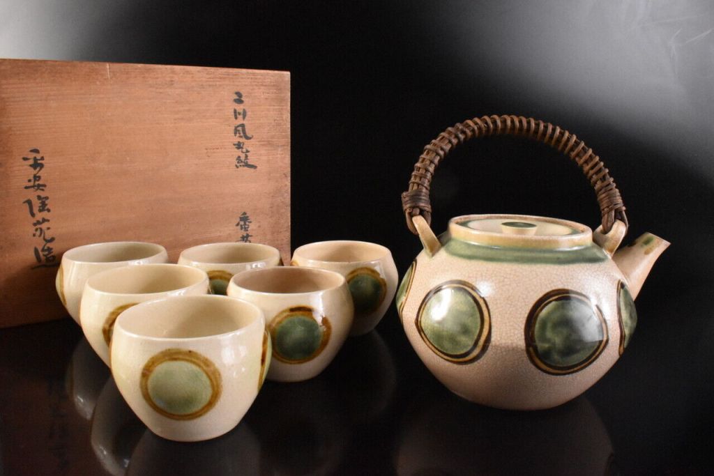 None of the cups or the tea pot have chips or cracks. Condition is remarkably good. Comes with the original, quality shiho-san paulownia tomobako or storage box of which the lid bears his calligraphy.