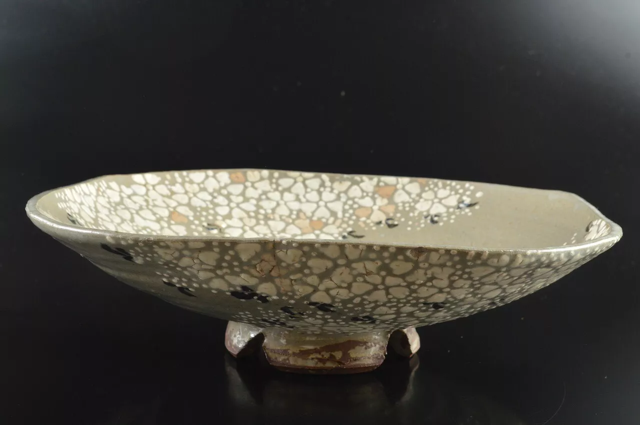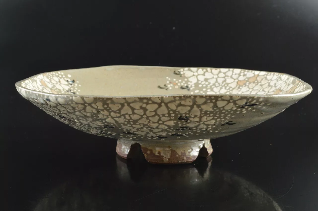 This is a large and finely decorated Kyo kashiki, overlayed with many petals of plum flowers. Finely shaped and decorated with great care. It has fine inlay petals in numerous colours. This would be a great piece to use for fruits or a salad. Its decorations extend to towards the backside as well. Standing on a four footed stand.