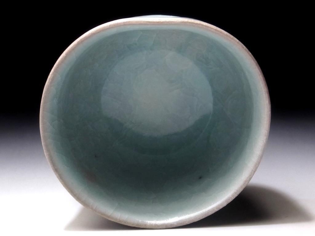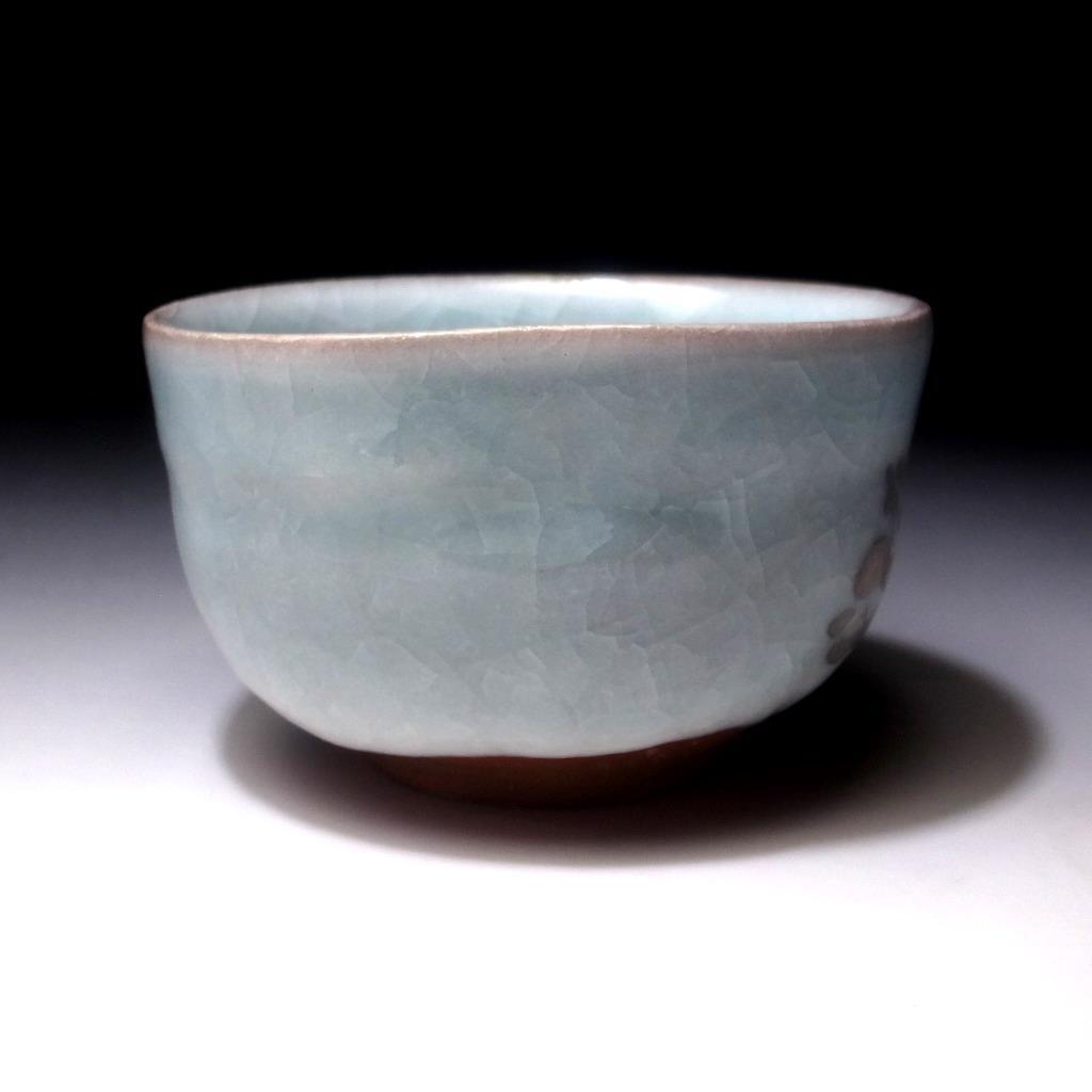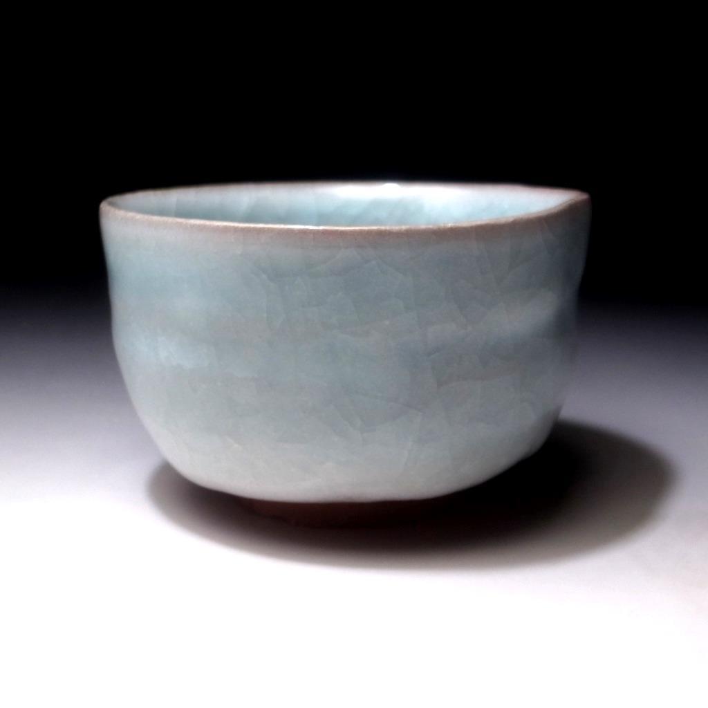 A magnificent celadon chawan, ceremonial tea bowl by the celebrated Kyoto artist Zenko Yasuda, his real name was Masahiro Yasuda. He was born in Kyoto in 1926 and stayed here for most of his life. Yasuda Zenko studied at the Kyoto Craft & Fabric University where he specialised in the making and building of kilns. Afterwards he studied pottery under the 6th Kiyomizu Rokubei (1901-1980). After going independent he build a kiln called Rokushin No Kama in Kyoto. Zenko Yasuda created unique and distinctive stoneware using complex glazing techniques. He passed in 2011 at the age of 86. A well respected 20th century Japanese potter.