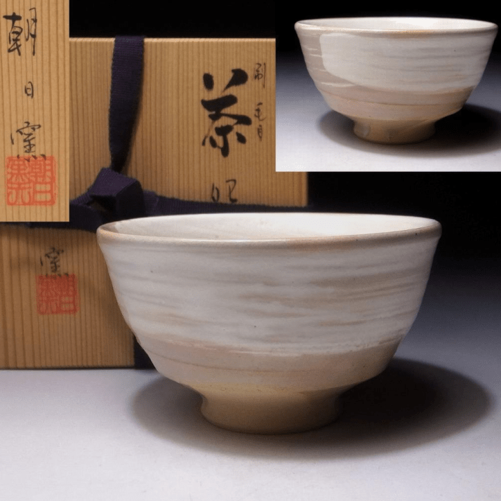 This is a simple chawan or ceremonial tea bowl of Asahi ware by the 14th generation Matsubayashi Hosai (1921-). This lineage is entirely devoted to the continuance of the traditional techniques and methods beholden to Asahi ware. The bowl features a white hakeme or brush stroke design over a base glaze of ash. Graduated from the ceramics department at Kyoto Daini High School. After high school he graduated from the Kyoto Ceramic Training Institute. Asahi ware is a type of Japanese pottery traditionally from the Uji region of Kyoto prefecture – known as the centre of tea culture. More specifically it is said to have originated across from Byodo-in Temple near Uji River, nestled at the foot of Mount Asahi.