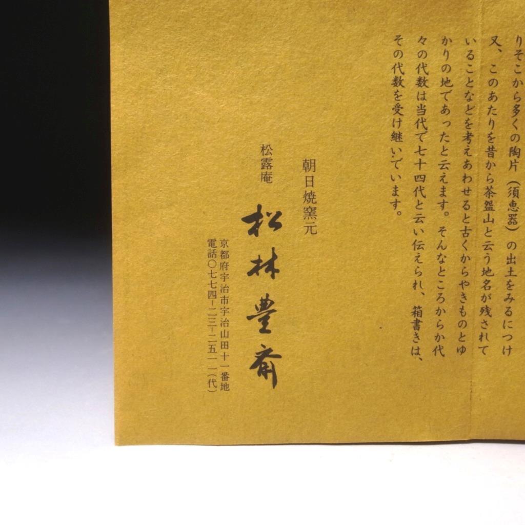 Matsubayashi Hosai has been selected for the Nitten Exhibition and the Japan Craft and Fine Art Exhibition. Held his very first private exhibition at the Mitsukoshi’s department store in Osaka in 1952 and three years after, his premiere exhibition at Mitsukoshi’s located in Nihombashi in 1955. Since then held over 30 private exhibitions at Takashimaya in Kyoto and other venues. He is an executive of the Kyoto Traditional Ceramic Society.