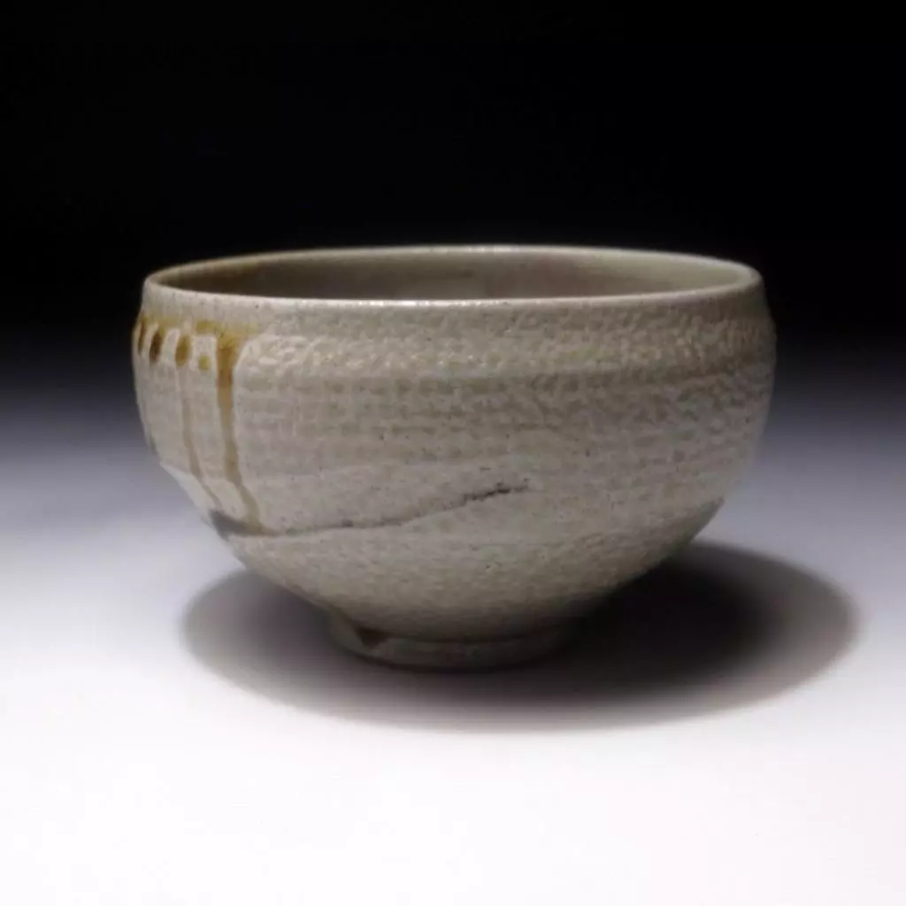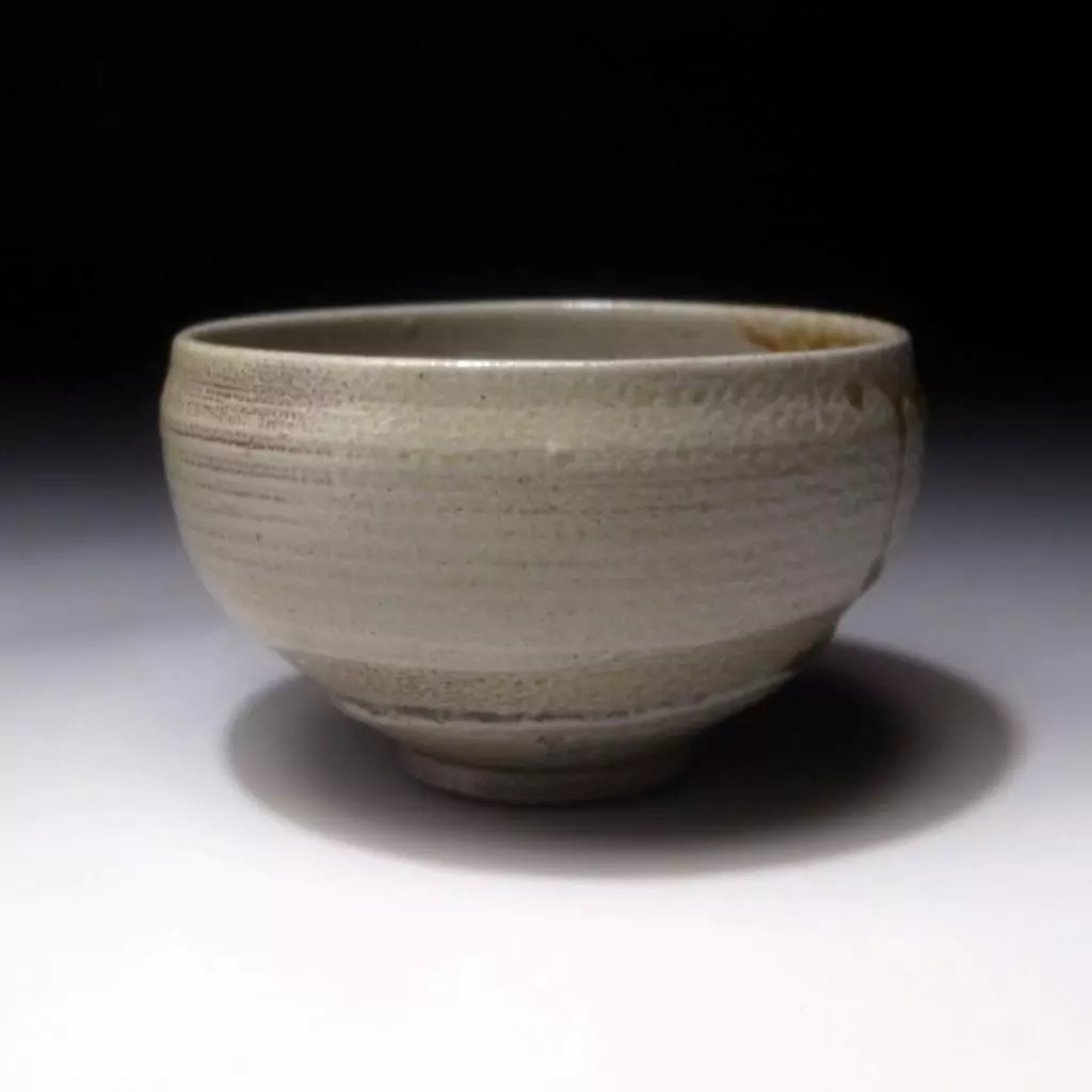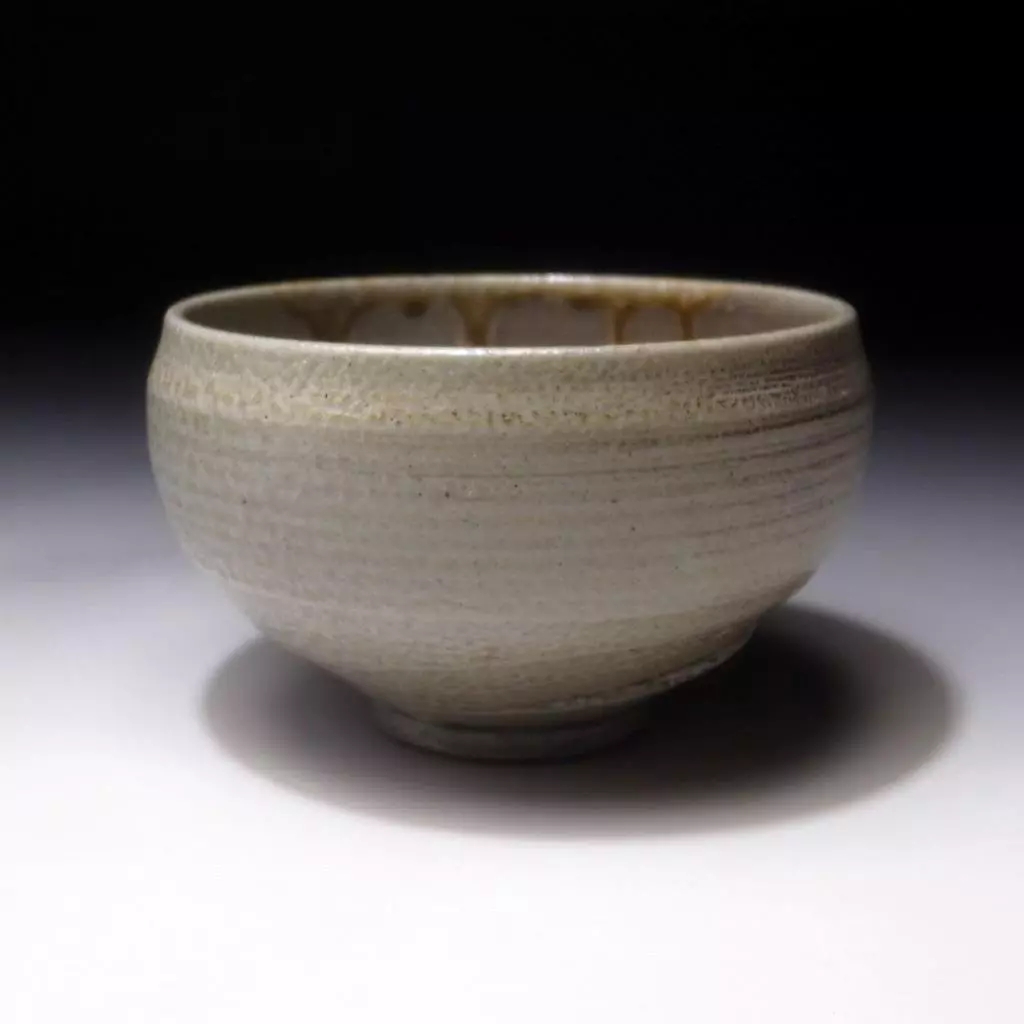 This is an exemplary ao Bizen chawan or ceremonial blue Bizen tea bowl by the second generation Fujiwara. Wheel-thrown and showing a single, strong carving spiralling from the foot towards the rim. The glaze it got through wood-firing is stunning with the entire bowl being covered by the blue gray glaze called ao-Bizen. On top of blue glaze are many pools of ashes that turned to glass going from the rim towards the koudai (foot-ring), and here the carving that spirals around the bowl plays a part as some of the ashes got caught by the ridges. An absolutely stunning and one of a kind work. Fujiwara Rakuzan II stands as one of the most distinguished masters of Bizen ware in the twentieth century. Born Rokuji Fujiwara, he was designated as a Holder of an Important Intangible Cultural Property of Okayama Prefecture in 1953, a recognition that affirms his exceptional contribution to Japanese ceramic art and the preservation of traditional craftsmanship.