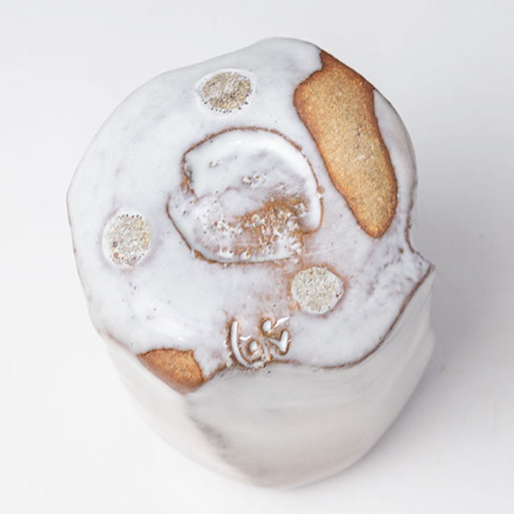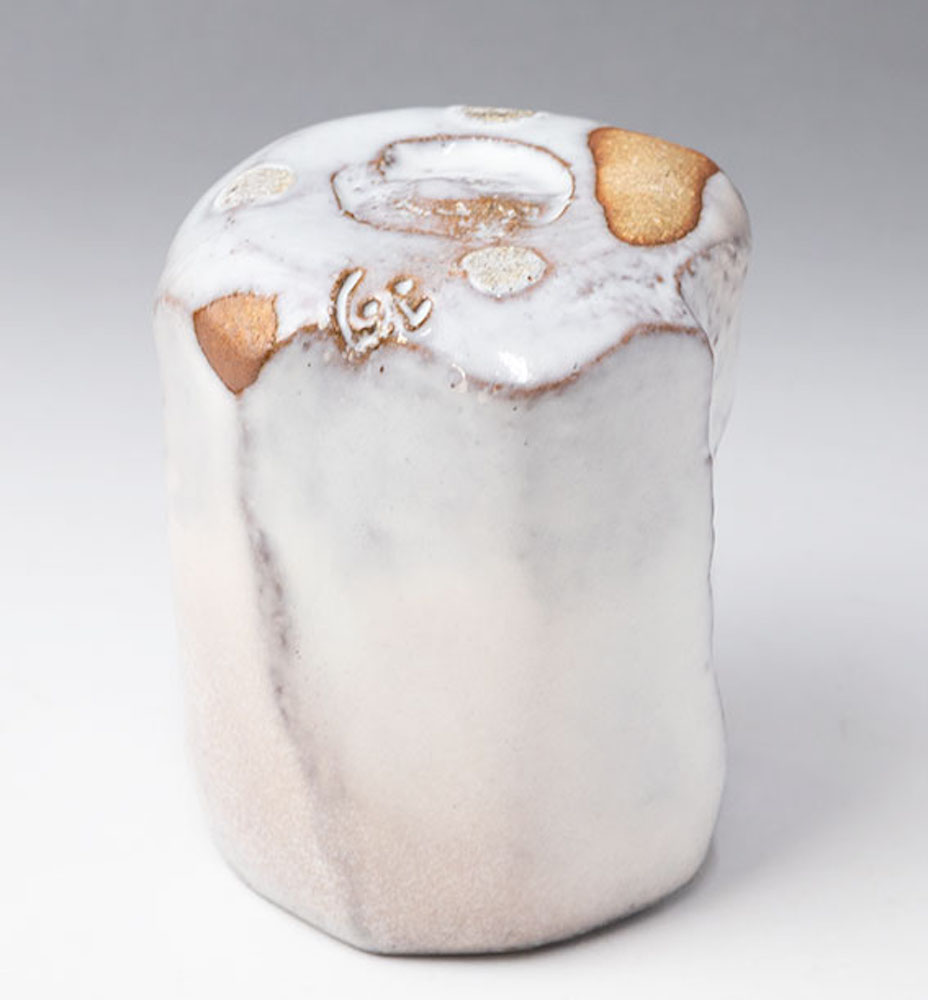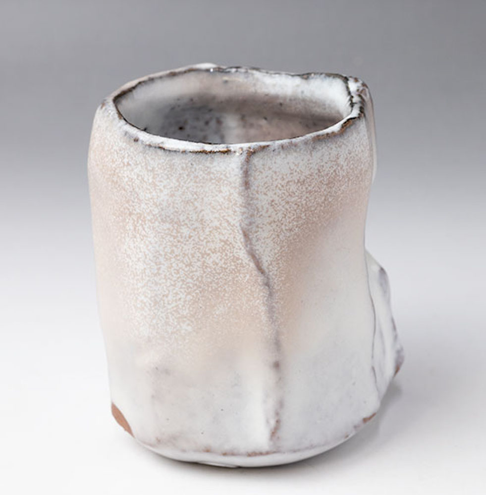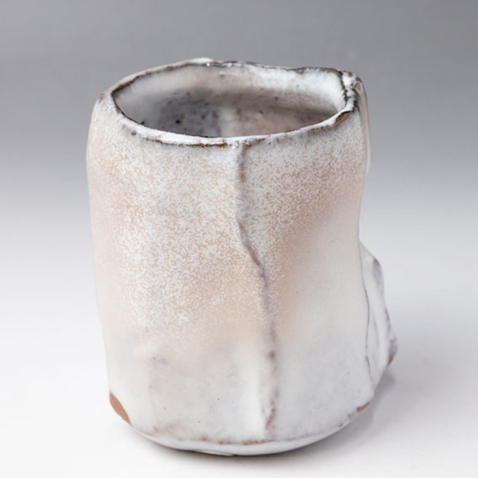 Masanao’s education as a sculptural artist has led to a highly sculptural approach to his work using the distinctive kurinuki technique of carving and scooping out forms from a solid block of clay to produce boldly-cut forms. This artist has given the traditional Hagi tea world a very sculptural feel with his kurinuki carved out method and boldly-cut forms. Some are mountainous cuts in creamy white glazes, while other pieces are more rounded Chojiro-esque (the founder of Raku), with a mottled blue ash glaze. He also gets a wonderful pink “yohen” kiln effect that contrasts well with the white Hagi glaze.