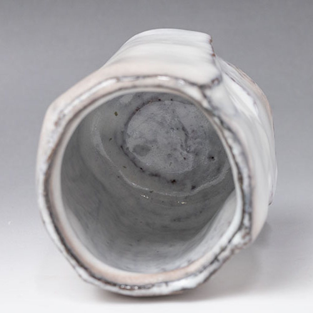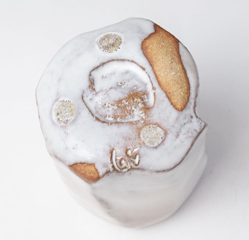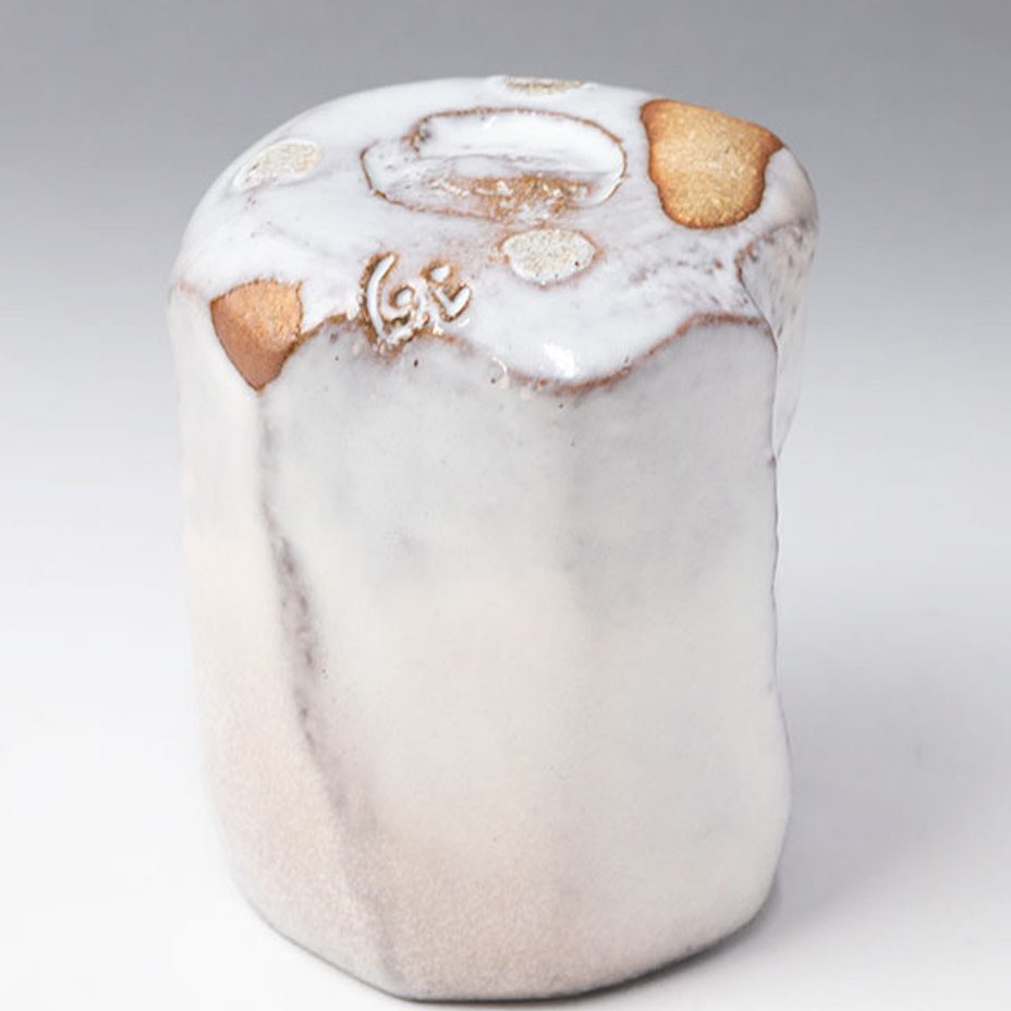 Masanao’s education as a sculptural artist has led to a highly sculptural approach to his work using the distinctive kurinuki technique of carving and scooping out forms from a solid block of clay to produce boldly-cut forms. This artist has given the traditional Hagi tea world a very sculptural feel with his kurinuki carved out method and boldly-cut forms. Some are mountainous cuts in creamy white glazes, while other pieces are more rounded Chojiro-esque (the founder of Raku), with a mottled blue ash glaze. He also gets a wonderful pink “yohen” kiln effect that contrasts well with the white Hagi glaze.